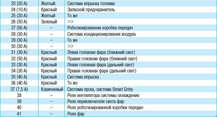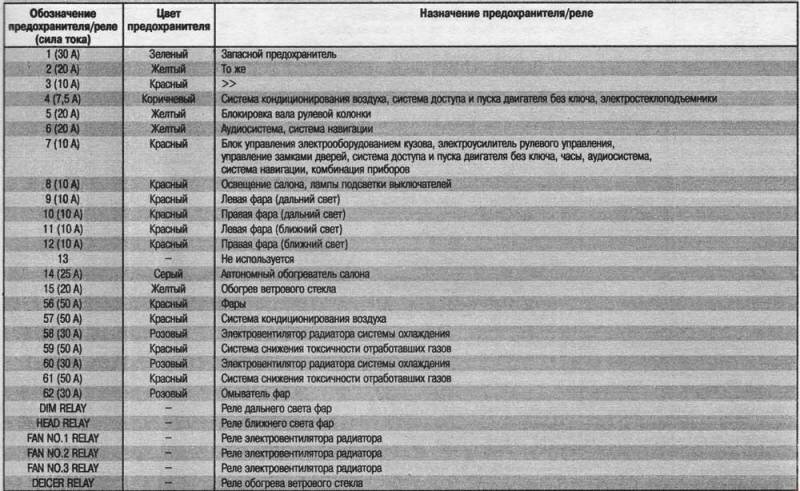 Обозначение предохранителей и реле в монтажном блоке в моторном отсеке