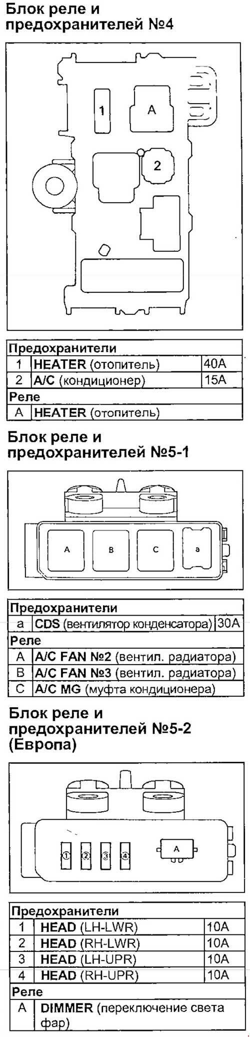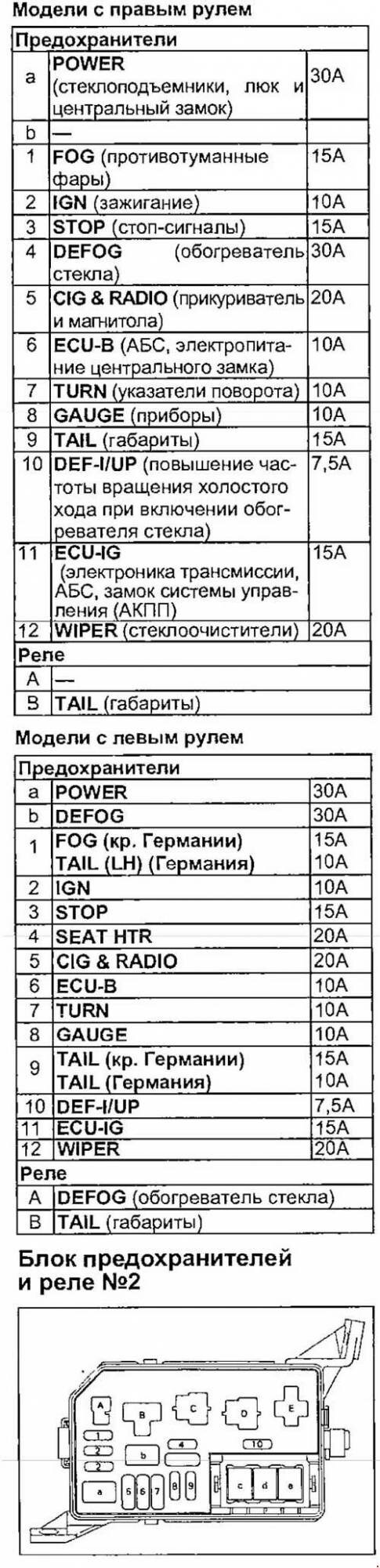 Тут приводятся обозначение и расшифровка блоков предохранителей для различных моделей автомобилей Toyota - Toyota Supra, Toyota Avensis, Toyota Corona Premio, Toyota Corolla, Toyota Auris, Toyota RAV4, Toyota Estima, Toyota Camry и некоторых других. Сами электрические схемы указанных авто вы можете посмотреть в другом разделе. Каждый из предохранителей защищает свою цепь и на панели предохранителя имеется обозначение защищаемой этим предохранителем цепи. Конечно никогда не заменяйте предохранители проволокой, даже в качестве временного устранения неисправности. Это может привести к серьёзным повреждениям проводки или даже к возгоранию. Мощность предохранителя указана на самом предохранителе. Если новый предохранитель сразу же перегорает, необходимо отыскать причину этого прежде, чем устанавливать новый предохранитель. Если у вас нет предохранителя с номинальным значением, то следует использовать предохранитель с более низким значением, как можно ближе к номинальному. Наиболее вероятной причиной перегорания предохранителя является короткое замыкание в цепи, вызванное порвавшимся или износившимся проводом. Вторая часть сборника.