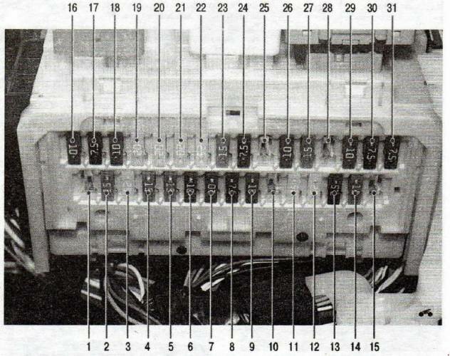 Реле и плавкие вставки в монтажном блоке, расположенном в салоне авто