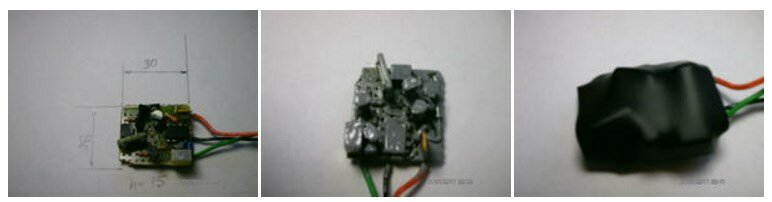 Макет прерывателя собран на небольшой макетной плате, универсальной, окрашен лаком и всунут в термоусадочную пленку. Всё размещено в корпусе из пластмассы. Кроме того, силикон для гашения механических колебаний. Крепление прерывателя выполнено с помощью хомута, а соединение проводов - пайкой.