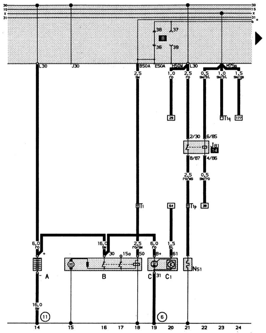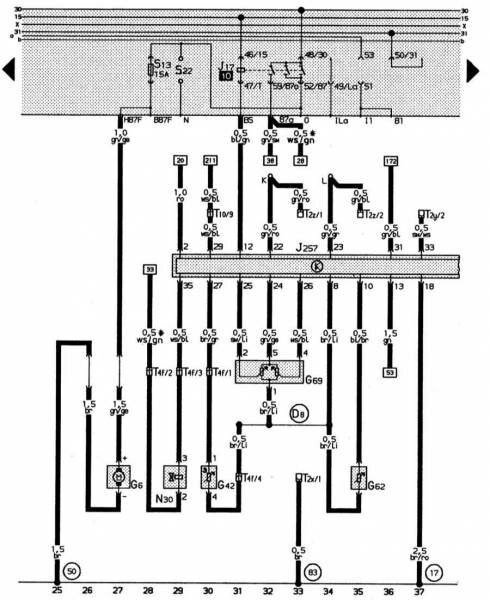 Лямбда-зонд с подогревом, электромагнитный клапан бачка с активированным углем, регулятор положения дроссельной заслонки. Цвета проводов: br – к, br/ge – к/ж, bl/sw – сн/ч, gn/sw – з/ч, sw – ч, gr/sw ср/ч, ro/ge – кр/ж, gr/ws ср/б, sw/ro – ч/кр, ge – ж, br/sw – к/ч, sw/bl – ч/сн, li/sw – л/ч, li – л, ro/sw кр/ч.