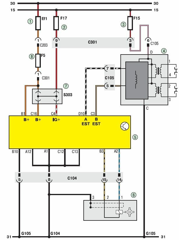 1 - плавкая вставка (80 А); 2, 3 - предохранители (15 А); 4 - катушка зажигания; 5 - электронный блок управления двигателем; 6 - датчик положения коленчатого вала; 7 - соединительная колодка; 8 - предохранитель (10 А).