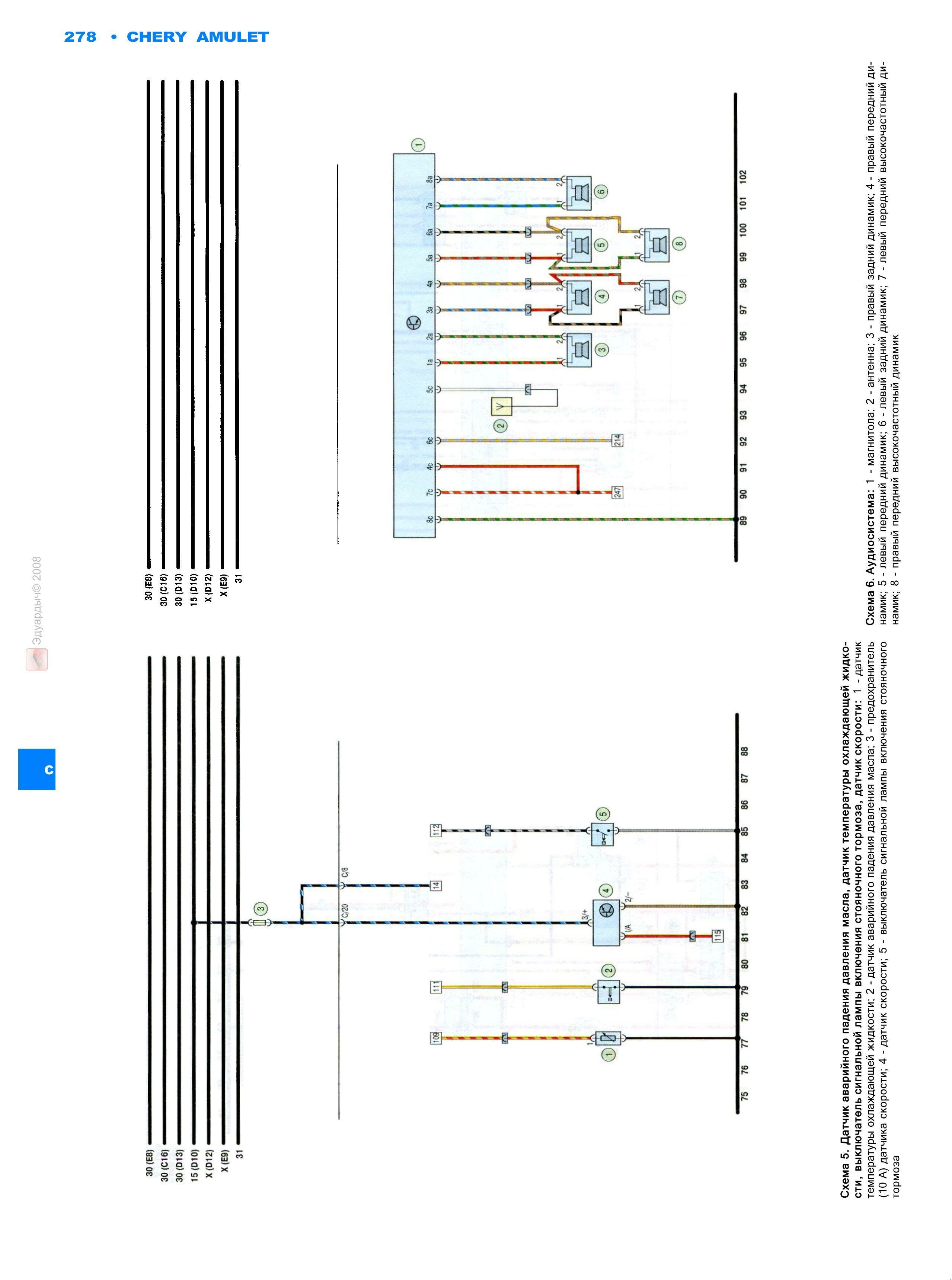 Предлагаем вашему вниманию цветные схемы электрооборудования на Чери Амулет с 2006 г.в. и младше. Экономичный и неприхотливый двигатель объемом 1.6 л. мощностью 94 л.с., работающий на бензине АИ-92 позволит экономить на эксплуатационных расходах. Современная система активной и пассивной безопасности включает в себя 4-х канальный ABS, ремни безопасности для всех пассажиров и 2 фронтальные подушки безопасности.