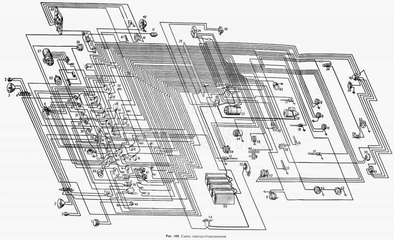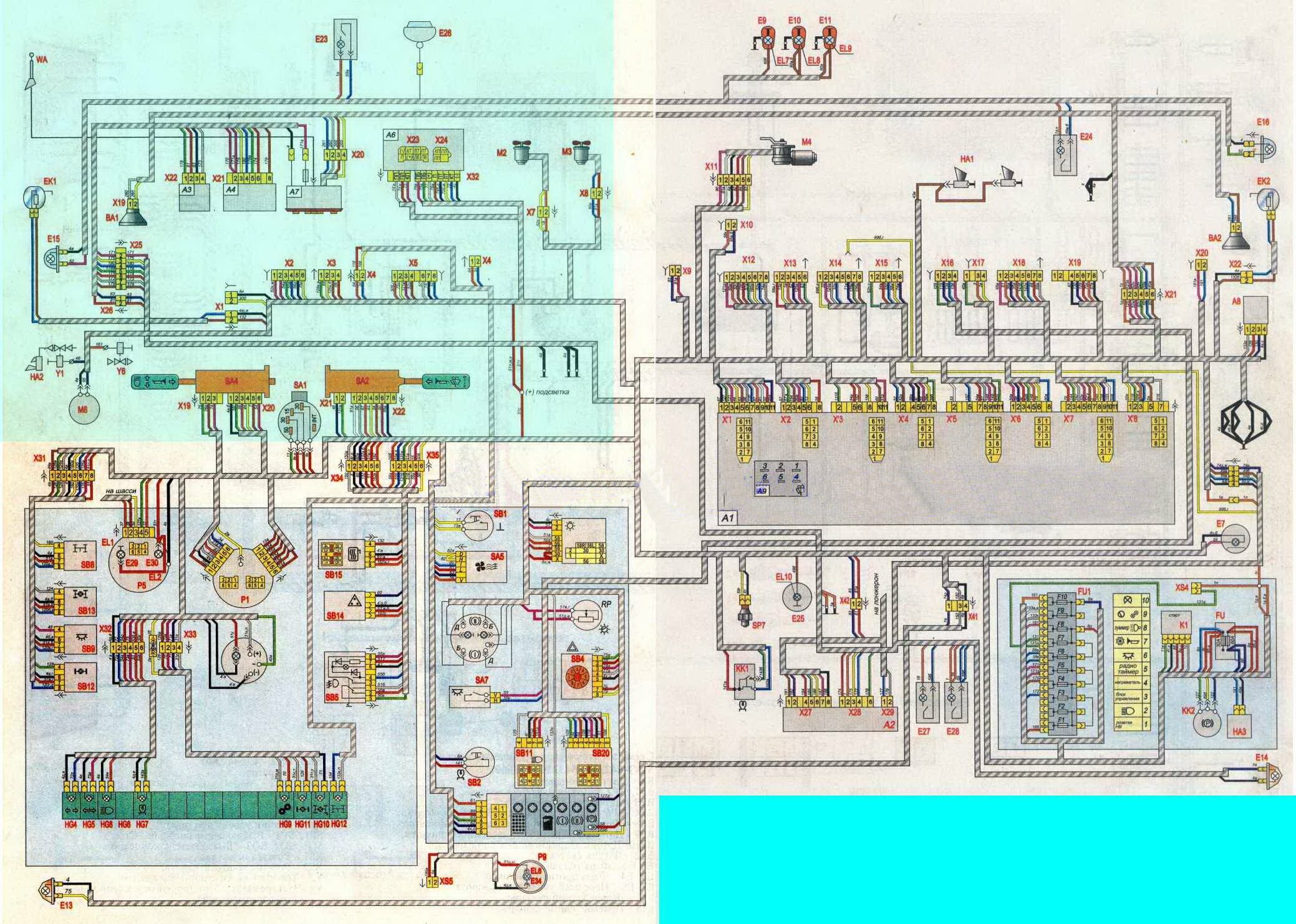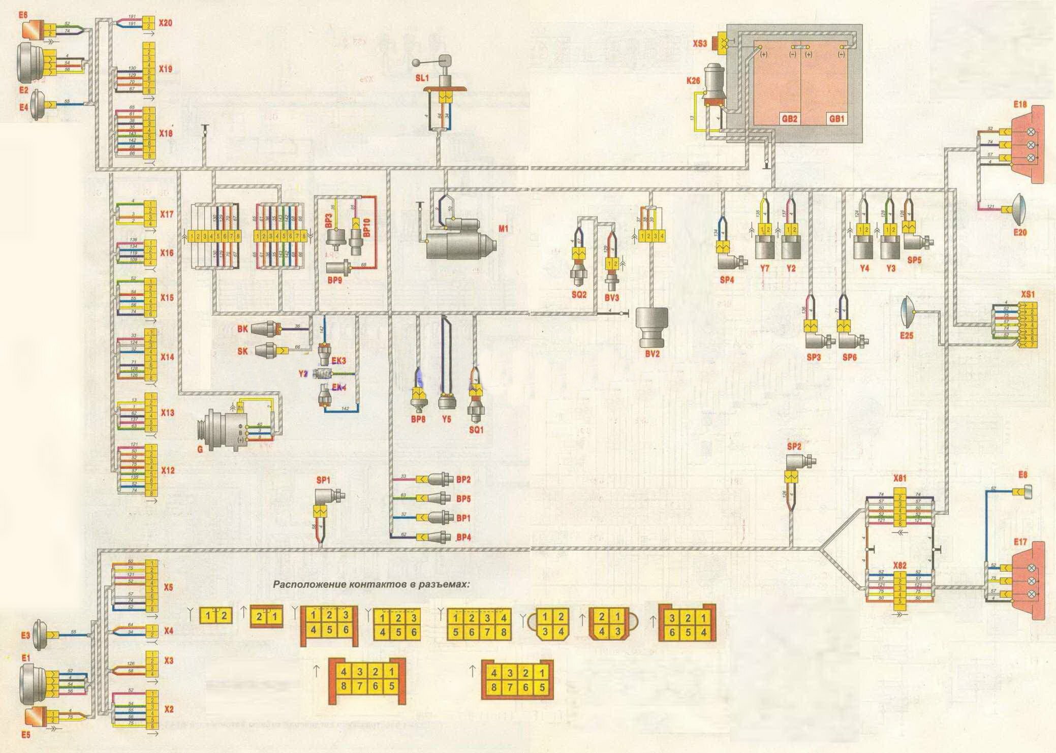 Al — Блок предохранителей и реле, A3 — Прерыватель стеклоочистителя, А6 — Прерыватель указателя поборота, А7 — Магнитола, А8 — Реле блокировки демультипликатора, BAI, BA2— Громкоговоритель, ВК — Датчик температуры, ВР1.ВР2 — Датчик давления воздуха, ВРЗ — Датчик давления масла, ВР4.ВР5 — Датчик аварийного давления воздуха, BPI0 — Датчик аварийного давления масла, BV2 — Датчик спидометра, BV3 — Датчик скорости, ЕКЗ,ЕК4 -Свеча ЭФУ, Е1,Е2 — Фара головная, ЕЗ,Е4 — Фара противотуманная, Е5,Е6 — Передний фонарь, Е7 — Фонарь, Е8 — Фонарь номерного знака, Е9...Е11 — Фонарь знака автопоезда, EI2 — Фонарь подкузовной, Е13,Е14 — Боковой указатель поворотов, EI5.EI6 — Фонарь габаритный, Е17,Е18 — Задний фонарь, Е20 — Фонарь заднего хода, Е23.Е24 — Плафон освещения кабины, Е25 — Плафон освещения двигателя, Е26 — Фара — прожектор, Е28,Е27 — Плафон освещения спального места, ЕК1,ЕК2 — Фонарь освещения стеллажей, ЕЗО — Нагреватель зеркал, EL1...EL6 — Лампа подсветки приборов, FU1 — Предохранитель 60 А, FU2 — Предохранитель 30 А, FU3—FU9 — Предохранитель 8 А, FU11 — Предохранитель 16 А, G — Генератор, GBl, GB2 — Аккумуляторная батарея 6СТ I90A, НА 1 — Комплект электрических сигналов, НА2 — Сигнал пневматический, КК1 — Добавочное сопротивление, КК2 — Прерыватель контрольной лампы стояночного тормоза, К1 — Реле стартера, Ml — Стартер, М2, МЗ — Электродвигатель отопителя, М4 — Моторедуктор стеклоочистителя, М8 — Электродвигатель омывателя, РР — Комбинация приборов, Р2 — Тахометр, PS —Спидометр, RP — Реостат подсветки, XSl — Розетка основная, XS3 — Розетка, XS4 — Розетка переносной лампы в кабине, XS5, XS6 — Розетка, WA — Антена, SA1 — Выключатель стартера, SA2 — Переключатель стеклоочистителя, SA3 — Переключатель света главный, SA4 — Переключатель указателей поворота, SA5 — Переключатель отопителя, SA7 — Выключатель фонаря, SA8 — Выключатель плафона, SB1, SB3 — Выключатель кнопочный, SB4 — Выключатель аварийной сигнализации, SA9 — Выключатель клапана гидроотбора, Кнопочные выключатели с подсветкой: SB5 — Противотуманных фар, SB8 — Выключатель нейтрали, SB9 — Плафона освещения двигателя, SB11 — Фара—искателя, SB12 — Межколесного дифференциала, SB13 — Межосевого дифференциала, SB 14 — Фонарей автопоезда, SB 15 — Подогрева зеркал, SB20 — Освещения стеллажей, SK — Датчик аварийной температуры, SLI — Датчик уровня топлива, SP1.SP6 — Выключатель сигналов «стоп», SP7 — Выключатель, SQ1, SQ2 — Выключатель.