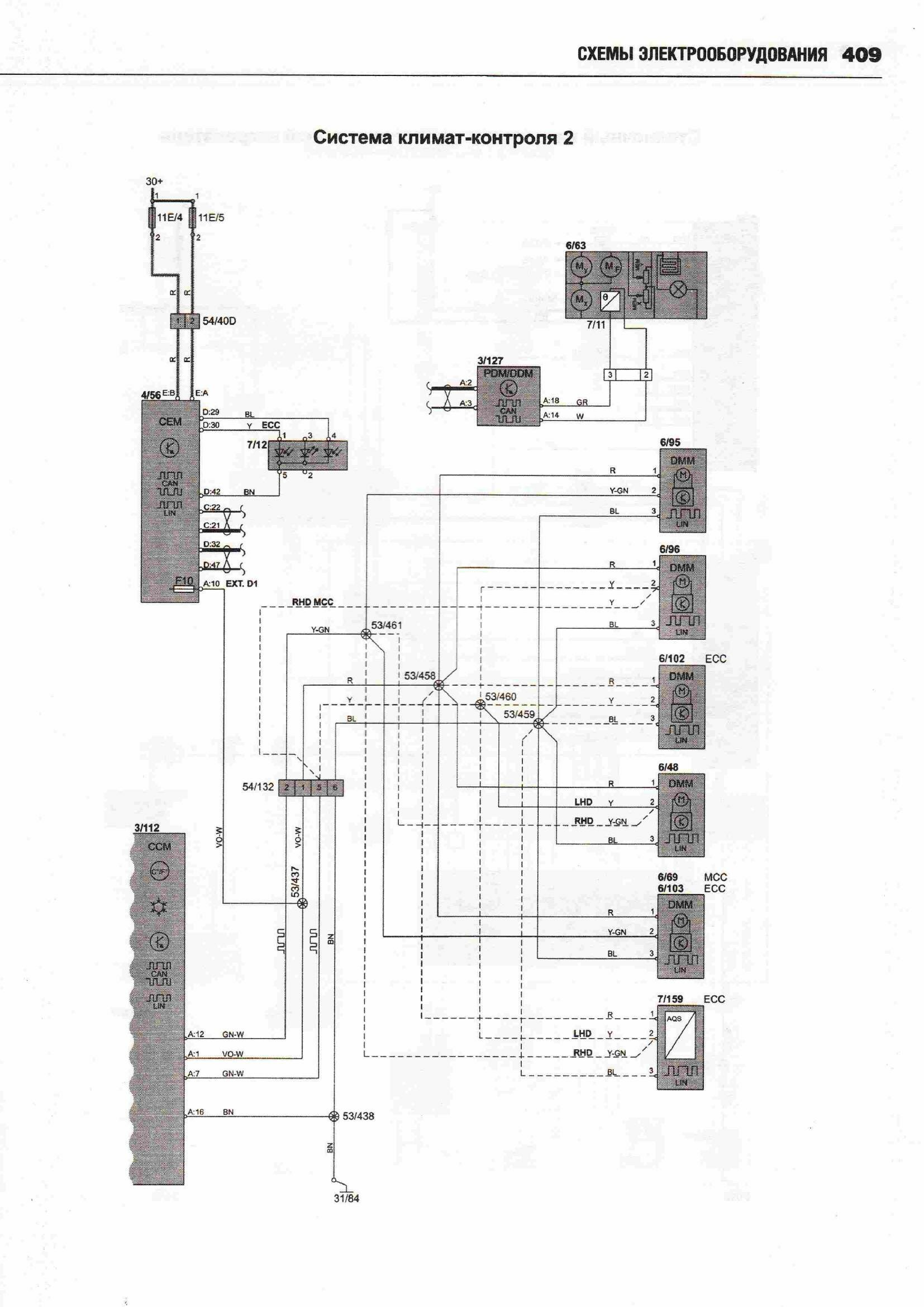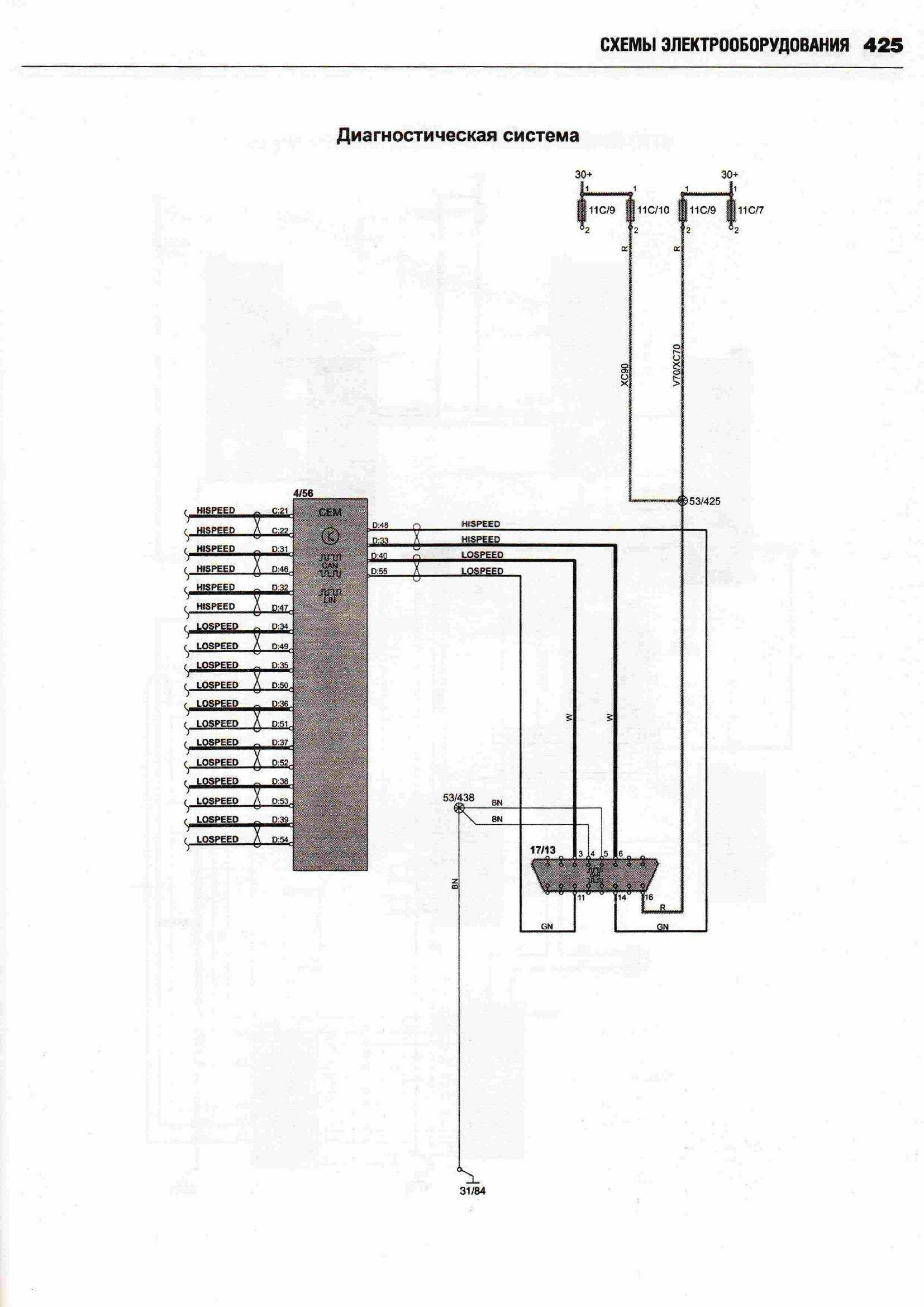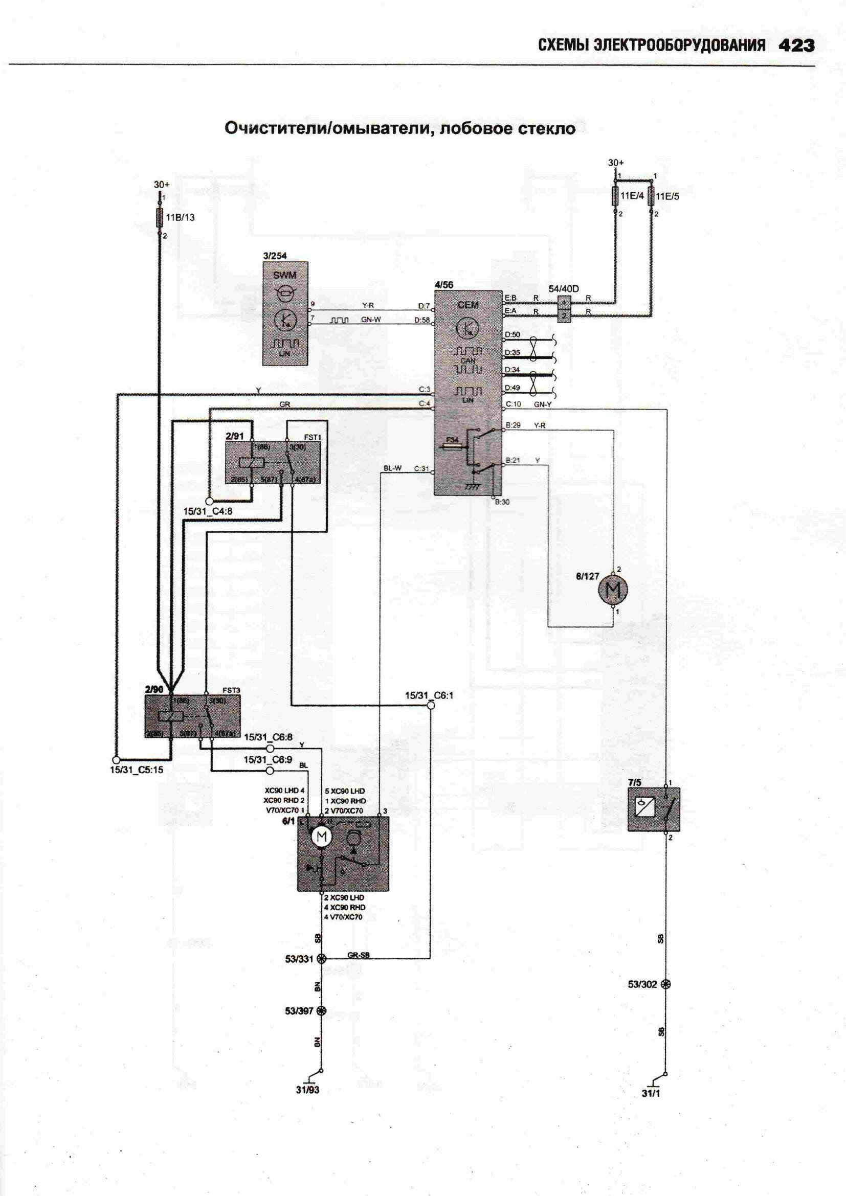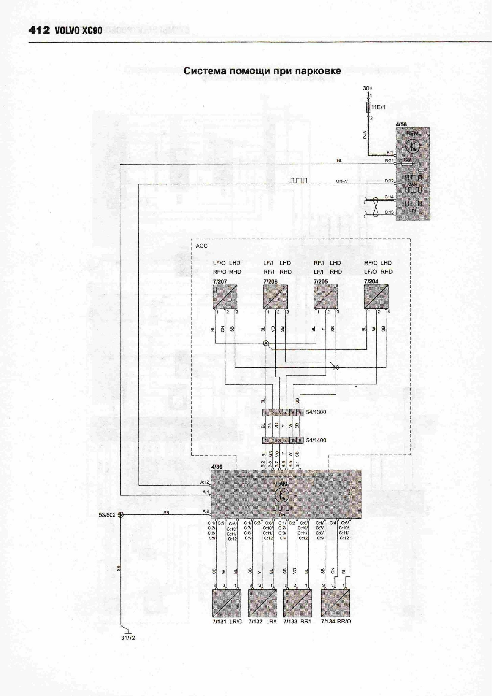 Принципиальные схемы электрооборудования автомобиля ВОЛЬВО ХС 90 с 2002 (двигатели типов бензин 2,5, 2,9, 3,2, 4,4 л и дизель 2,4). Начало сборника схем данного авто находится здесь. А тут вы можете посмотреть схемы фар и блока предохранителей. В Volvo 90 были разработаны активные биксеноновые фары, способные следовать направлению поворота автомобиля. Такие фары значительно повышают видимость в темное время. Процессор получает данные о различных параметрах движения автомобиля, проводит их анализ и настраивает систему для оптимального освещения дороги. Фары могут поворачиваться под углом до 15 градусов в каждом направлении, таким образом, общий диапазон поворота составляет 30 градусов. Это позволяет лучше и дальше освещать дорогу. Во избежание износа системы в дневное время функция поворота фар автоматически отключается. Ещё предлагается установка камеры для облегчения парковки. Это устройство, цель которого предотвратить наезд на людей при движении задним ходом и облегчить процесс парковки. Камера с большим углом охвата показывает зону сзади автомобиля. Причем система не только позволяет водителю видеть, что происходит сзади автомобиля, но она еще показывает планируемую траекторию движения задним ходом. Изображение выводится на экран навигационной системы, размещенный поверх панели приборов. Угол поля изображения охватывает всю зону за автомобилем, при этом обеспечивается минимальное искажение изображения. На экран выводятся вспомогательные линии, которыми обозначен периметр предполагаемой парковки после завершения требуемых маневров. Эти линии изменяются в зависимости от вращения рулевого колеса, помогая водителю сделать правильный выбор. Камера полностью интегрирована с системами авто.
