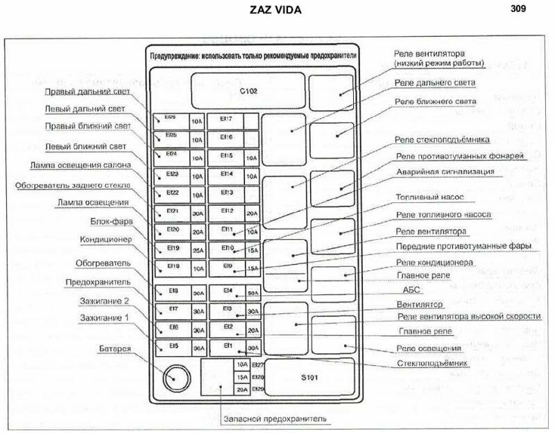 Схема блока предохранителей моторного отсека, реле и лампы Заз Вида