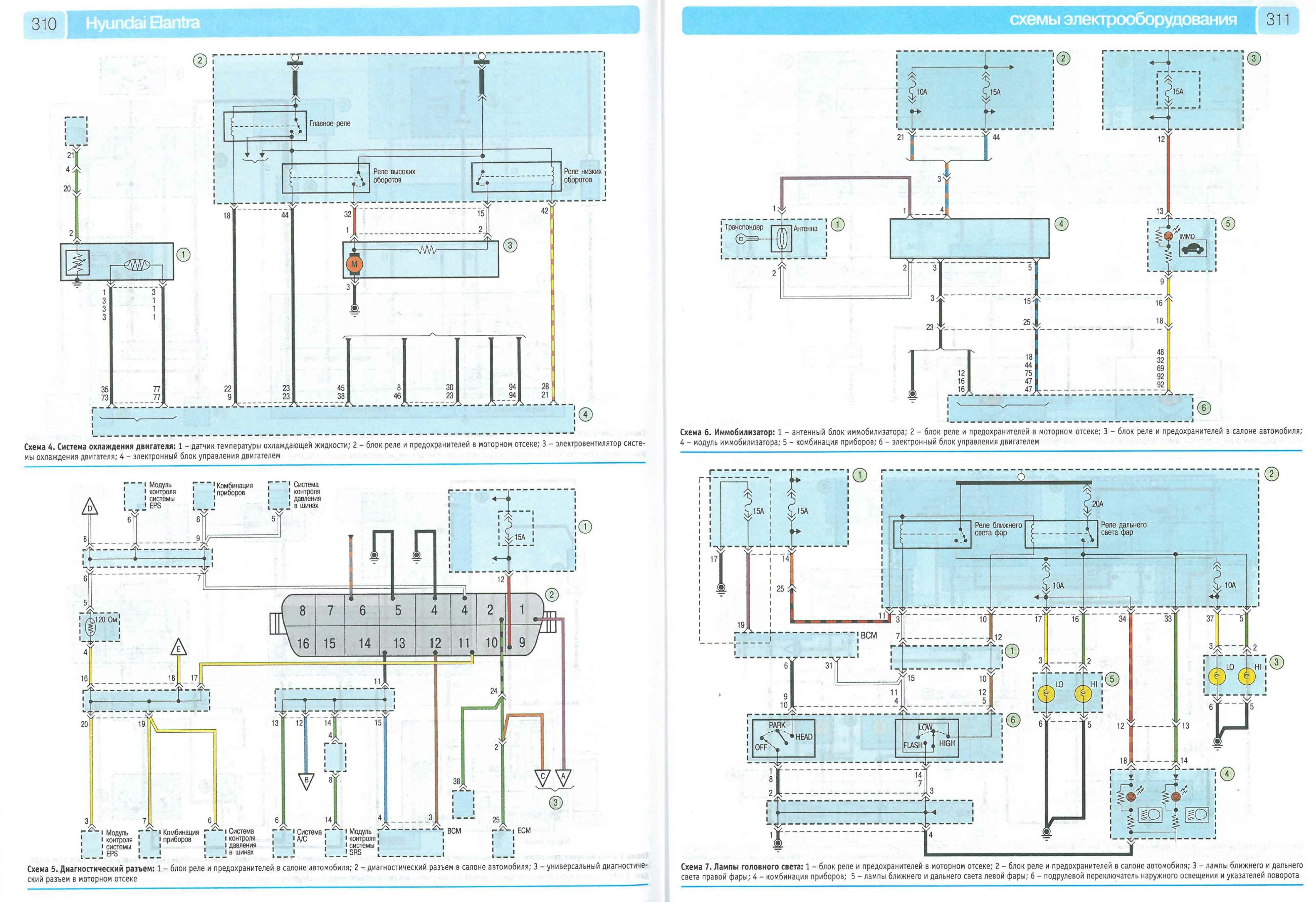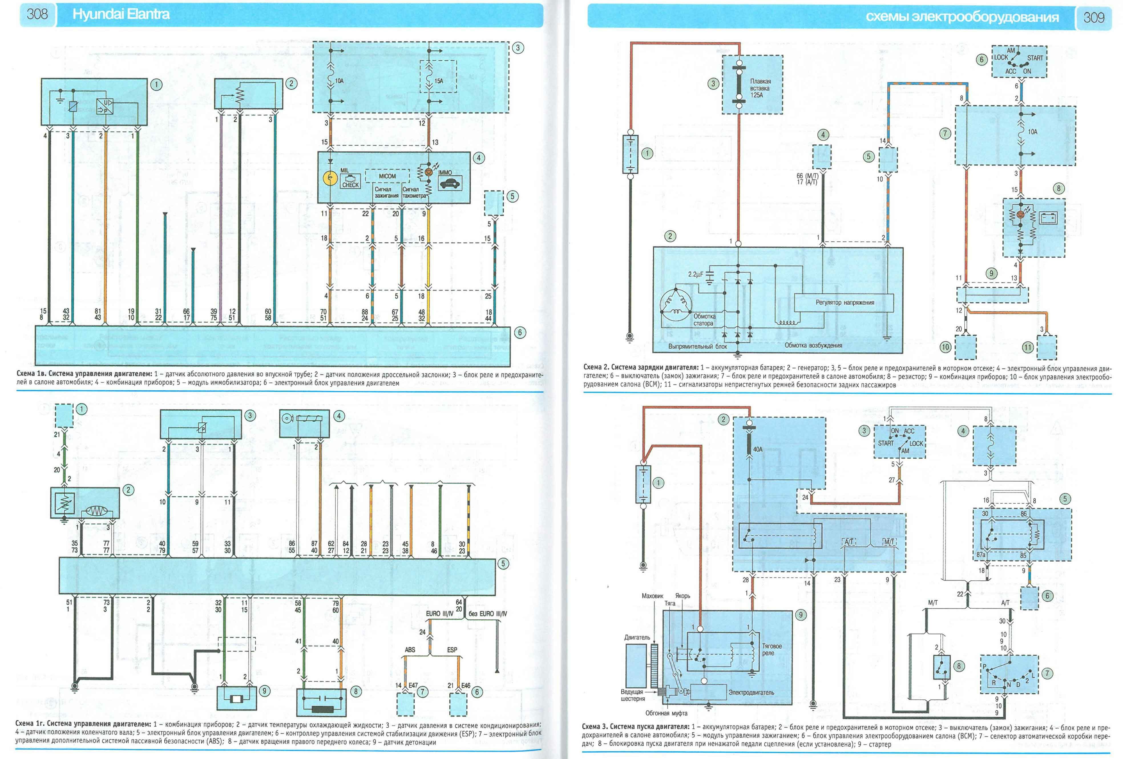 Цветные русскоязычные схемы электрооборудования легкового автомобиля HYUNDAI ELANTRA IV выпускаемого с 2006 года. Более старые модели смотрите здесь. В данном авто система электрооборудования отрицательного заземления имеет напряжение 12 вольт. Питание для электрооборудования поступает от свинцово–кислотного аккумулятора, который подзаряжается от генератора. При работе с любым элементом электрооборудования автомобиля провод отрицательной клеммы аккумулятора должен быть отсоединен для предотвращения короткого замыкания и/или возгорания.