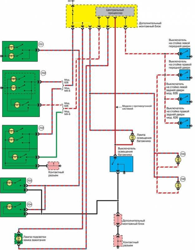 Л34 – лампочка освещения на левом козырьке Л35 – лампочка освещения порожка левой передней двери