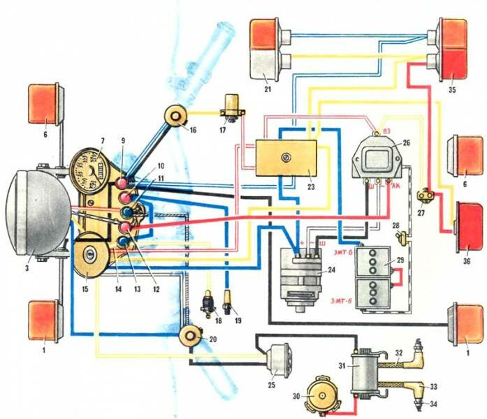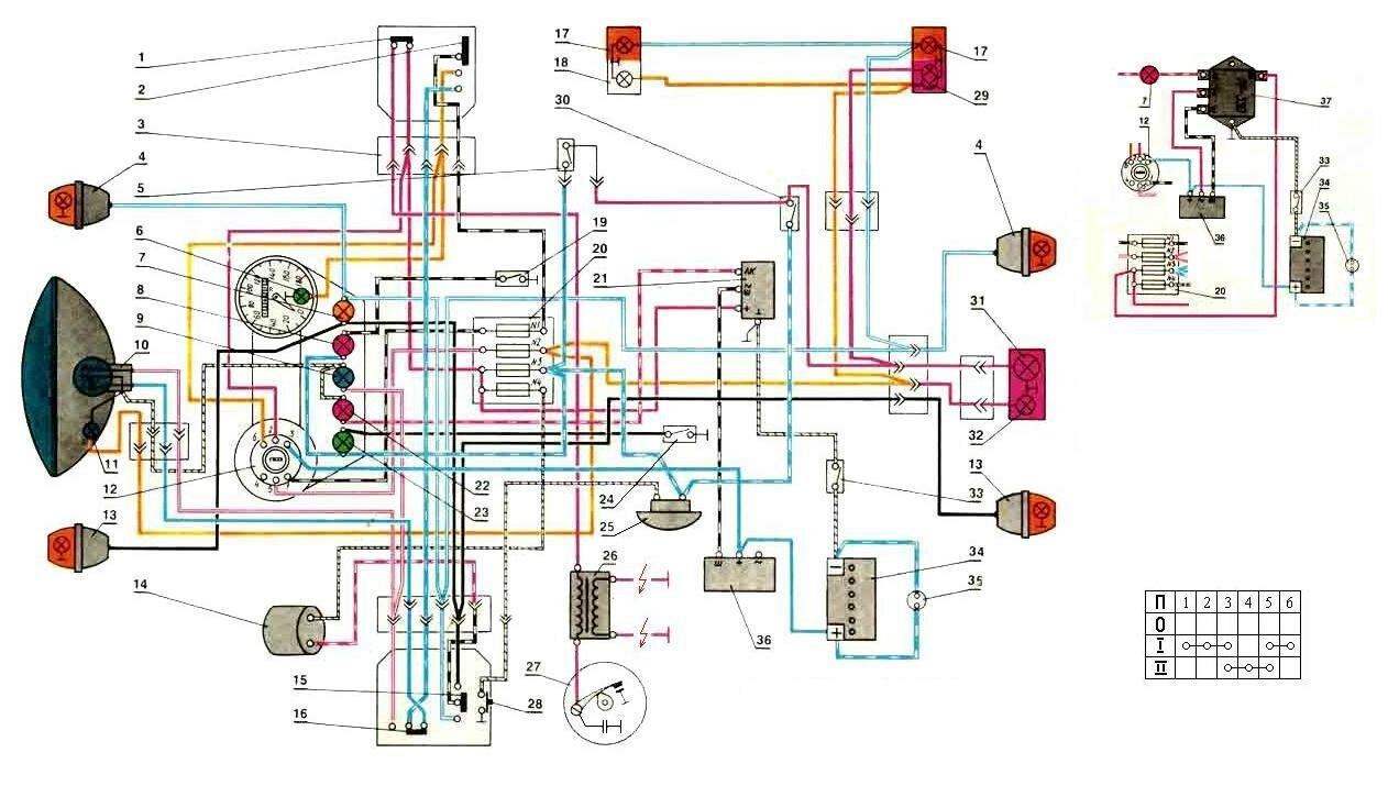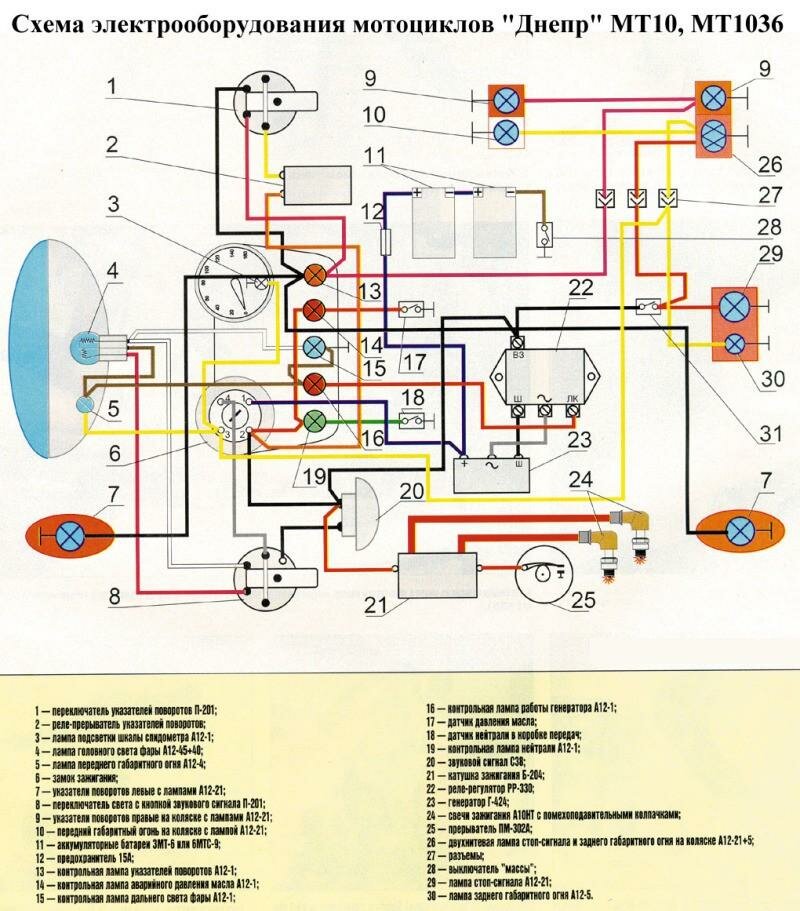 1 — фонарь левого указателя поворота Днепр МТ-10, 2 — лампа А12-21; 3 — фара; 4 — лампа А12-4 габаритного и стояночного света; 5 — лампа А12-45-40 дальнего и ближнего света; 6 — фонарь правого указателя поворота (на мотоцикле с коляской не подключен): 7 — спидометр; 8 — лампа А12-1 освещения спидометра; 9 — фонарь контрольной лампы указателей поворота; 10 — фонарь контрольной лампы аварийного давления масла; 11 — фонарь контрольной лампы дальнего света; 12 — фонарь контрольной лампы генератора; 13 — фонарь контрольной лампы датчика нейтрали; 14 — панель приборов; 15 — центральный переключатель; 16 — переключатель указателей поворота; 17 - прерыватель указателей поворота; 18 — пробка контакта; 19 — датчик аварийного давления масла; 20 — переключатель света; 21 — передний фонарь коляски 22 — лампа А12-21 габаритного света и сигнала тормоза на коляске; 23 — блок предохранителей; 24 — генератор; 25 — сигнал; 26 — реле-регулятор: 27 — выключатель сигнала торможения, 28 — включатель Днепр МТ-10 ;29 — аккумуляторная батарея; 30 — прерыватель; 31 — катушка зажигания; 32 — провод высокого напряжения; 33 — наконечник свечи; 34 — свеча зажигания; 35 — задний фонарь коляски; 36 — фонарь мотоцикла Днепр МТ-10; 37 — лампа А12 15 сигнала торможения; 38 — лампа А12-3 габаритного света освещения номерного знака.