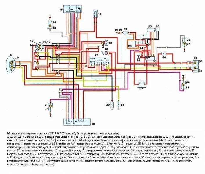 1 - фара ФГ 137Б2; 2 - лампа 12-45-40; 3, 4, 11, 12 - лампы А 12-1; 5 - звуковой сигнал С205Б; 6 - термореле включения электровентилятора 661.3710; 7 - электровентилятор; 8 - выключатель лампы "нейтраль"; 9 - лампа А 12-4; 10, 13 - лампа АМН 12-3-1; 14 - комбинированный переключатель (правый переключатель); 15 - выключатель ИЖВК 103; 16, 28, 32, 35, 39 - лампы А 12-21-3; 17, 29, 34, 38 - фонари -указатели поворота; 18 - датчик сигнализатора перегрева ТМ111; 19 - выключатель зажигания; 20, 23 - свечи зажигания; 21, 24 - свечные наконечники; 22, 25 - катушки зажигания; 26 - генератор ГП7; 27 - выпрямитель-регулятор напряжения БПВ14-10; 33 - лампа А 12-5; 30 - выключатель ИЖВК107; 31 - задний фонарь 111.3716; 36 - аккумуляторная батарея; 37 - предохранитель; 40 - переключатель сигнализации (левый переключатель); 41 - прерыватель указателей поворота.