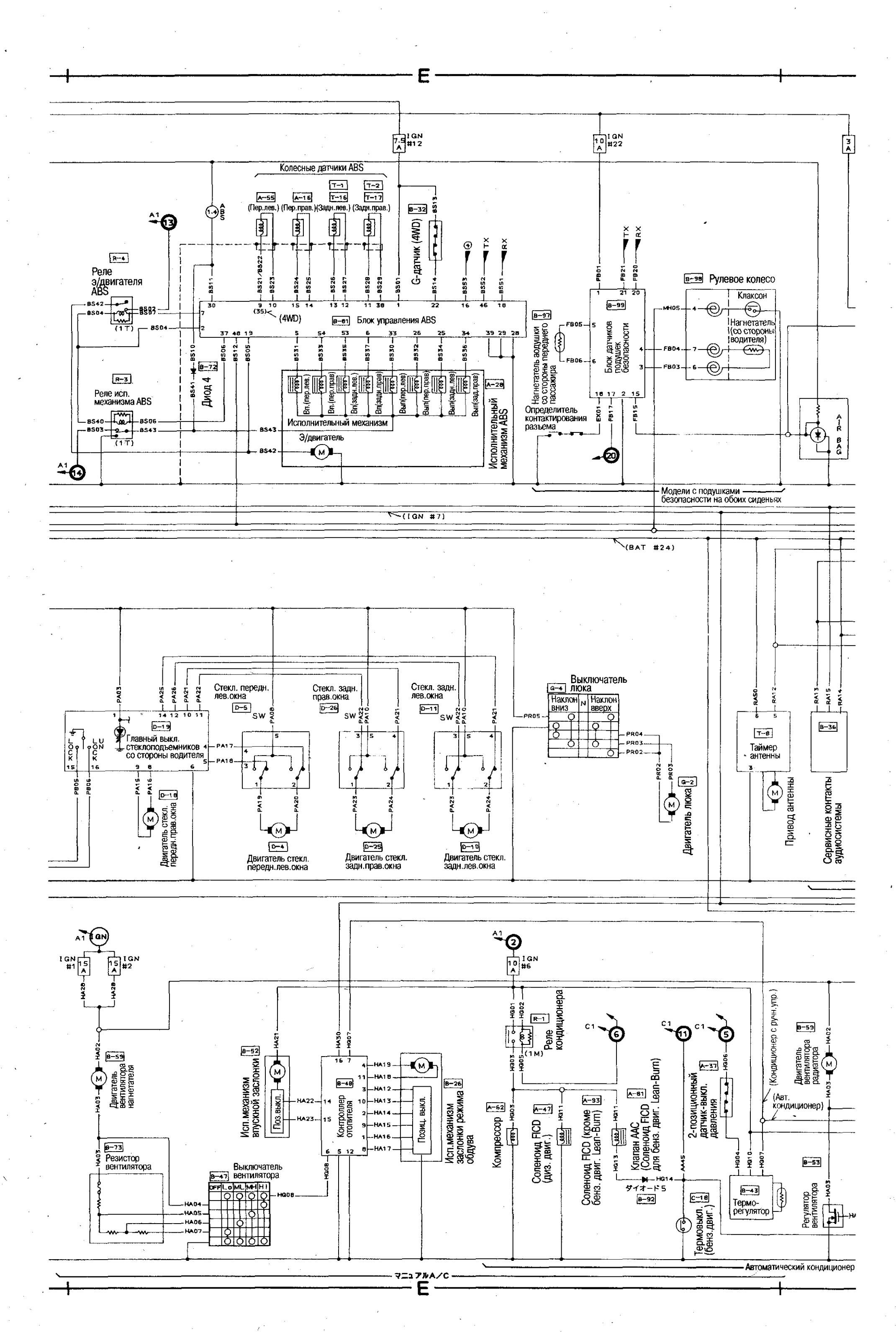 Электрические схемы автомобиля Nissan Bluebird - 1-я часть. Все схемы в высоком качестве и на русском языке. Скачать можно кликнув на кртинке и увеличив её. Остальные узлы электрооборудования Nissan Bluebird показаны тут. Для защиты электрических цепей используются предохранители с ножевыми контактами, цвет которых соответствует току защиты предохранителя. Исправность предохранителя определяют по наличию проволочного проводника, соединяющего выходные контакты предохранителя. Обозначения на схемах различных элементов, соединений и их расшифровка.