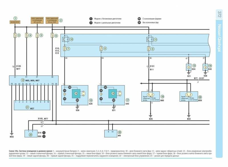 Цветные электрические схемы автомобиля Ниссан Кашкай с 2007г и Ниссан Кашкай +2 с 2008г полностью на русском языке, вы можете бесплатно посмотреть в данном материале. На электросхемах имеются модули системы тормозов, системы управления двигателем, подключение фар, ламп внутреннего освещения и т.д. Информация взята из открытых справочников и бесплатно предоставляется для работников СТО, а также автоэлектриков-самодельщиков. Внизу страницы имеются и фотографии блоков реле и предохранителей, с указанием функций каждого предохранителя. Это вторая часть. Остальные электросхемы для этого автомобиля смотрите тут.