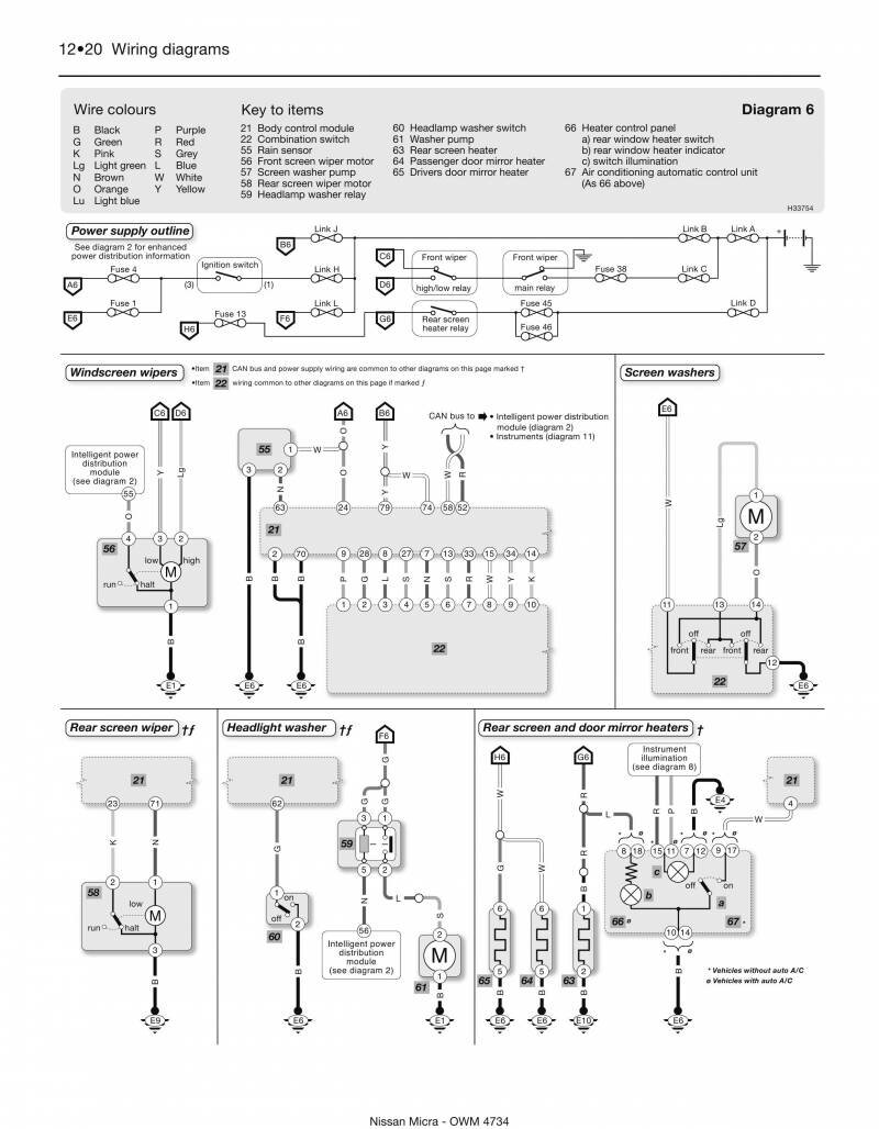 Схема очистителей и омывателей стёкол в Nissan Micra