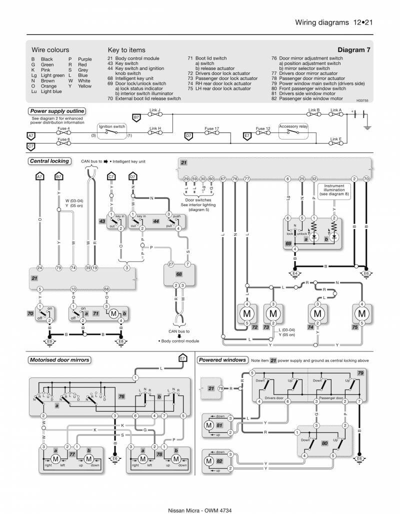 Электрическая система рассматриваемых в данной статье схем автомобия Nissan Micra, работает с напряжением 12 В. Соединение массы проходит через отрицательную клемму батареи. Батарея помещается в переднем левом углу двигательного отсека. Для запуска двигателя используется стартер, выключатель стартера является составной частью замка зажигания и предназначен для возбуждения установленного на стартере тягового реле. Встроенный в панель приборов индикатор заряда указывает на исправную работу электрооборудования, пока заряд батареи в норме. Принципиальные схемы в хорошем качестве и высокой чёткостью, но на английском языке. Дополнительная информация по электрооборудованию Ниссан Микра находится тут.