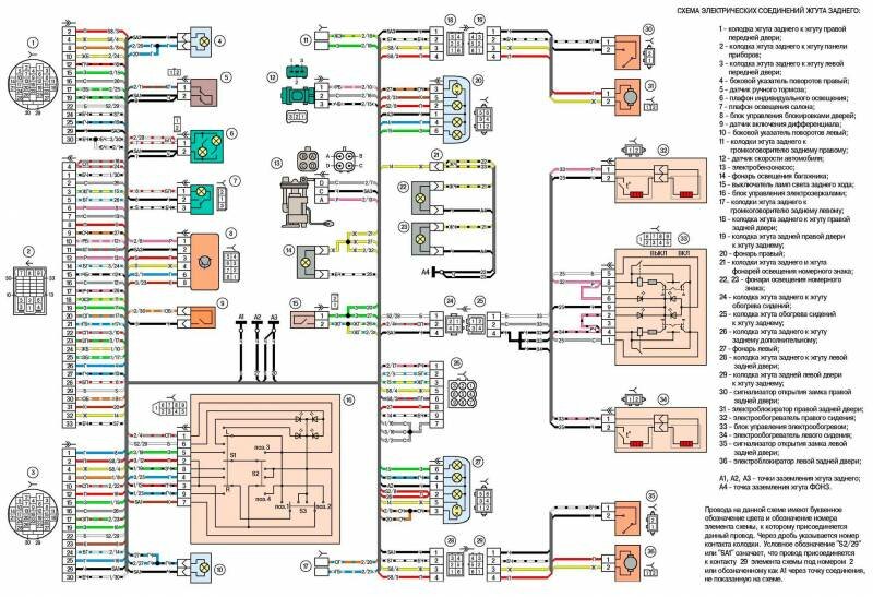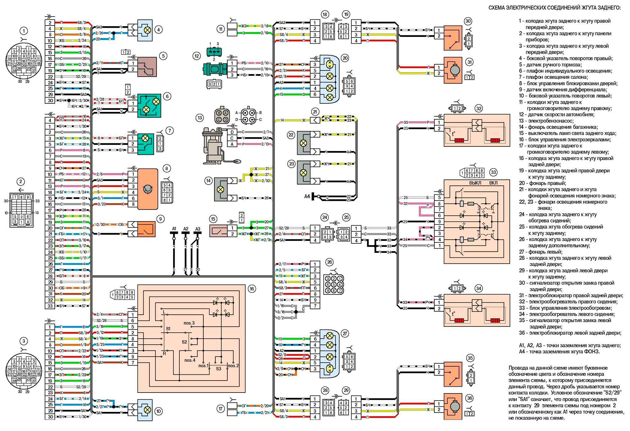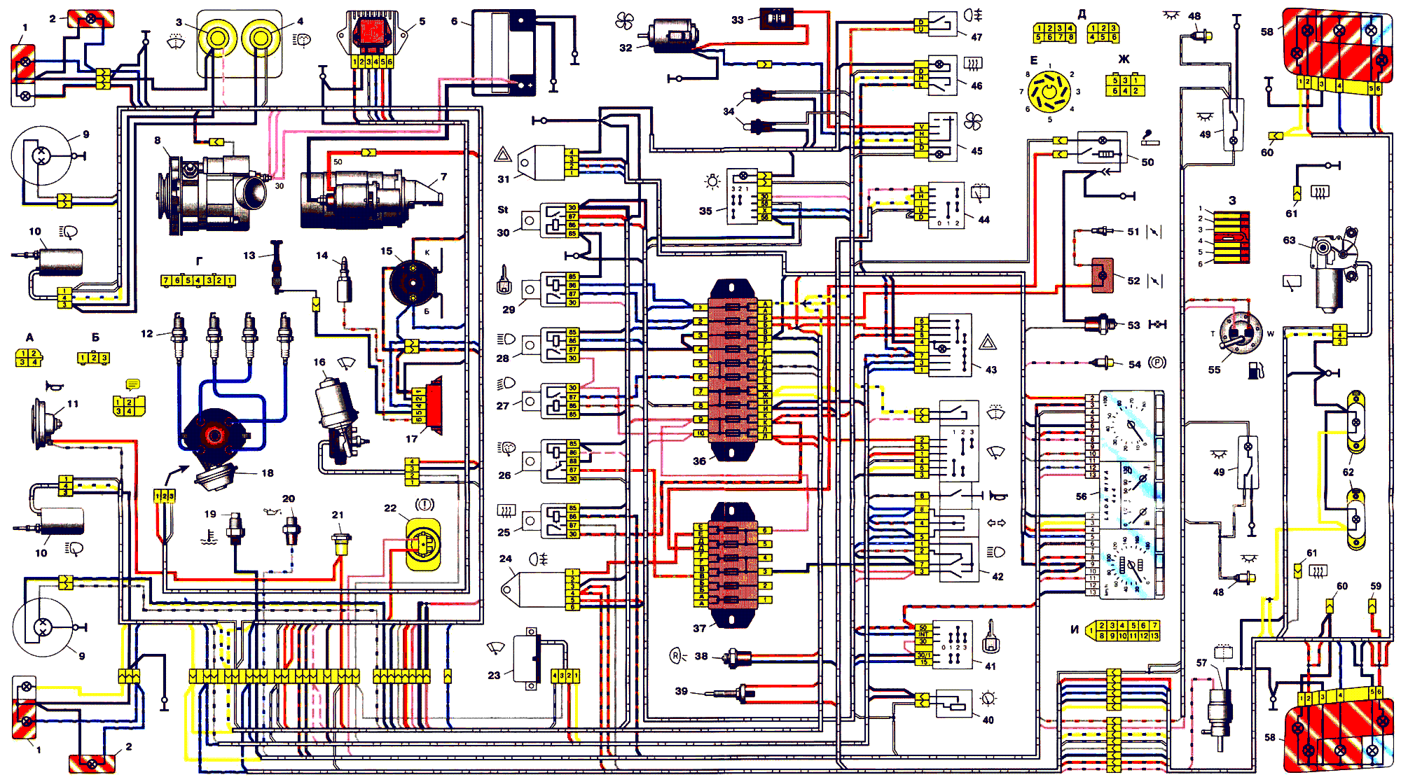 1. Передние фонари.2. Боковые указатели поворота.3. Электродвигатель омывателя ветрового стекла. 4. Электродвигатель омывателя фар*. 5. Коммутатор. 6. Аккумуляторная батарея. 7. Стартер Нива. 8. Генератор. 9. Фары нива. 10. Моторедукторы очистителей фар*.11. Звуковой сигнал.12. Свечи зажигания.13. Концевой выключатель карбюратора. 14. Электромагнитный клапан карбюратора.15. Катушка зажигания.16. Моторедуктор очистителя ветрового стекла. 17. Блок управления электромагнитным клапаном карбюратора.18. Датчик-распределитель зажигания.19. Датчик указателя температуры охлаждающей жидкости.20. Датчик указателя недостаточного давления масла.21. Штепсельная розетка переносной лампы. 22. Датчик сигнализатора недостаточного уровня тормозной жидкости. 23. Реле-прерыватель очистителя ветрового стекла.24. Реле включения ламп заднего противотуманного света. 25. Реле включения элемента обогрева заднего стекла. 26. Реле включения очистителей и омывателя фар*.27. Реле включения ближнего света фар. 28. Реле включения дальнего света фар.30. Реле включения стартера.31. Реле-прерыватель аварийной сигнализации и указателей поворота. 32. Электродвигатель отопителя.33. Добавочный резистор электродвигателя отопителя. 34. Лампы подсветки рычагов управления отопителем.35. Выключатель ламп наружного освещения.36. Основной блок предохранителей. 37. Дополнительный блок предохранителей.38. Выключатель фонаря заднего хода.39. Выключатель стоп-сигнала. 40. Регулятор ламп освещения приборов.41. Выключатель зажигания.42. Трехрычажный переключатель. 43. Выключатель аварийной сигнализации.44. Выключатель очистителей и омывателей фар.45. Переключатель электродвигателя отопителя.46. Выключатель элемента обогрева заднего стекла.47. Выключатель ламп заднего противотуманного света. 48. Выключатели плафонов, расположенные в стойках дверей.49. Плафоны освещения салона. 50. Прикуриватель. 51. Выключатель лампы сигнализатора прикрытия воздушной заслонки карбюратора.52. Лампа сигнализатора прикрытия воздушной заслонки карбюратора.53. Выключатель лампы сигнализатора включения блокировки дифференциала. 54. Выключатель лампы сигнализатора включения стояночного тормоза.55. Датчик указателя уровня и резерва топлива. 56. Комбинация приборов. 57. Электродвигатель омывателя заднего стекла. 58. Задние фонари. 59. Колодка для подключения дополнительных стоп-сигналов.60. Колодки для подключения боковых указателей габарита.61. Колодки для подключения к элементу обогрева заднего стекла. 62. Фонари освещения номерного знака. 63. Моторедуктор очистителя заднего стекла.