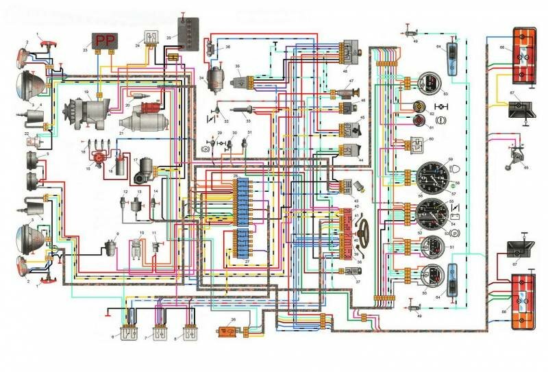 1 - боковые указатели поворота; 2 - передние фонари; 3 - фары; 4 - электродвигатели очистителей фар; 5 - звуковые сигналы Нива; 6 - реле включения очистителей и омывателя фар; 7 - реле включения ближнего света фар; 8 - реле включения дальнего света фар; 9 - электродвигатель омывателя ветрового стекла; 10 - датчик недостаточного уровня тормозной жидкости; 11 - штепсельная розетка переносной лампы; 12 - датчик контрольной лампы давления масла; 13 - датчик указателя давления масла; 14 - датчик указателя температуры охлаждающей жидкости; 15 - распределитель зажигания; 16 - свечи зажигания; 17 - электродвигатель стеклоочистителя; 18 - катушка зажигания; 19 - генератор; 20 - запорный клапан карбюратора; 21 - стартер; 22 - электродвигатель омывателя фар; 23 - регулятор напряжения; 24 - реле контрольной лампы заряда аккумуляторной батареи; 25 - аккумуляторная батарея; 26 - реле стеклоочистителя; 27 - дополнительный блок предохранителей; 28 - основной блок предохранителей; 29 - выключатель контрольной лампы стояночного тормоза; 30 - выключатель контрольной лампы блокировки дифференциала; 31 - выключатель света заднего хода; 32 - выключатель контрольной лампы воздушной заслонки карбюратора; 33 - выключатель стоп-сигнала; 34 - электродвигатель отопителя; 35 - реле-прерыватель указателей поворота и аварийной сигнализации; 36 - дополнительный резистор электродвигателя отопителя; 37 - выключатель освещения приборов; 38 - переключатель света фар; 39 - переключатель указателей поворота; 40 - выключатель звуковых сигналов; 41 - переключатель стеклоочистителя; 42 - выключатель омывателя ветрового стекла; 43 - выключатель зажигания; 44 - выключатель наружного освещения; 45 - переключатель отопителя; 46 - выключатель очистителей и омывателя фар; 47 - прикуриватель; 41 - выключатель аварийной сигнализации; 49 - выключатели плафонов, расположенные в стойках дверей; 50 - указатель давления масла с контрольной лампой недостаточного давления; 51 - указатель уровня топлива с контрольной лампой резерва топлива; 52 - тахометр Нива; 53 - контрольная лампа стояночного тормоза; 54 - контрольная лампа заряда аккумуляторной батареи; 55 - контрольная лампа воздушной заслонки карбюратора; 56 - спидометр; 57 - контрольная лампа наружного освещения; 58 - контрольная лампа указателей поворота; 59 - контрольная лампа дальнего света фар; 60 - реле-прерыватель контрольной лампы стояночного тормоза; 61 - контрольная лампа уровня тормозной жидкости; 62 - контрольная лампа блокировки дифференциала; 63 - указатель температуры охлаждающей жидкости; 64 - плафоны ваз 2121; 65 - датчик указателя уровня и резерва топлива; 66 - задние фонари; 67 - фонари освещения номерного знака.