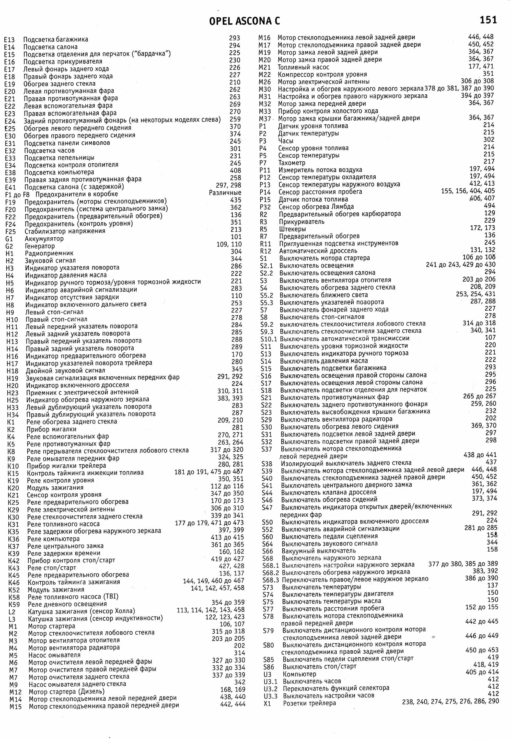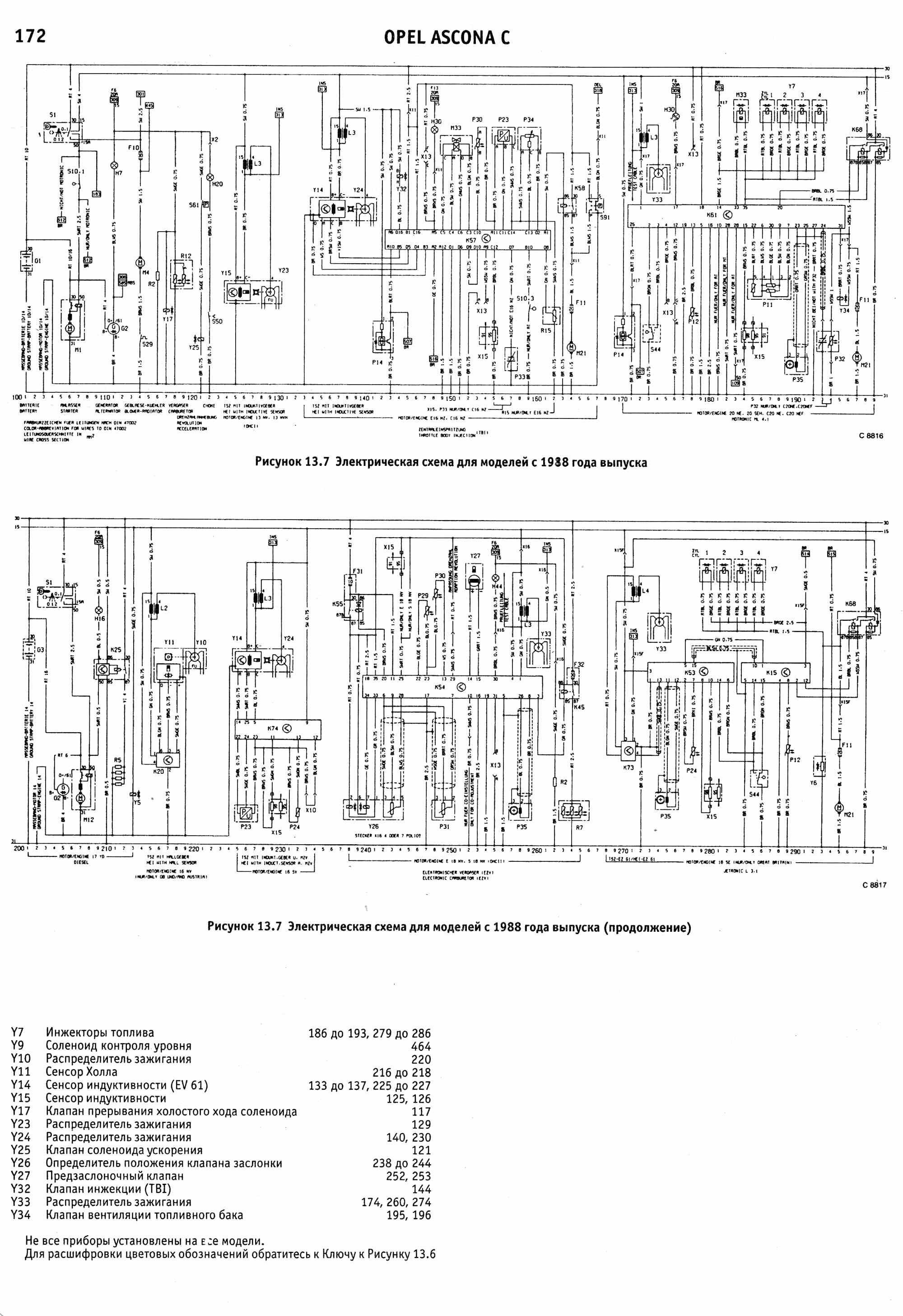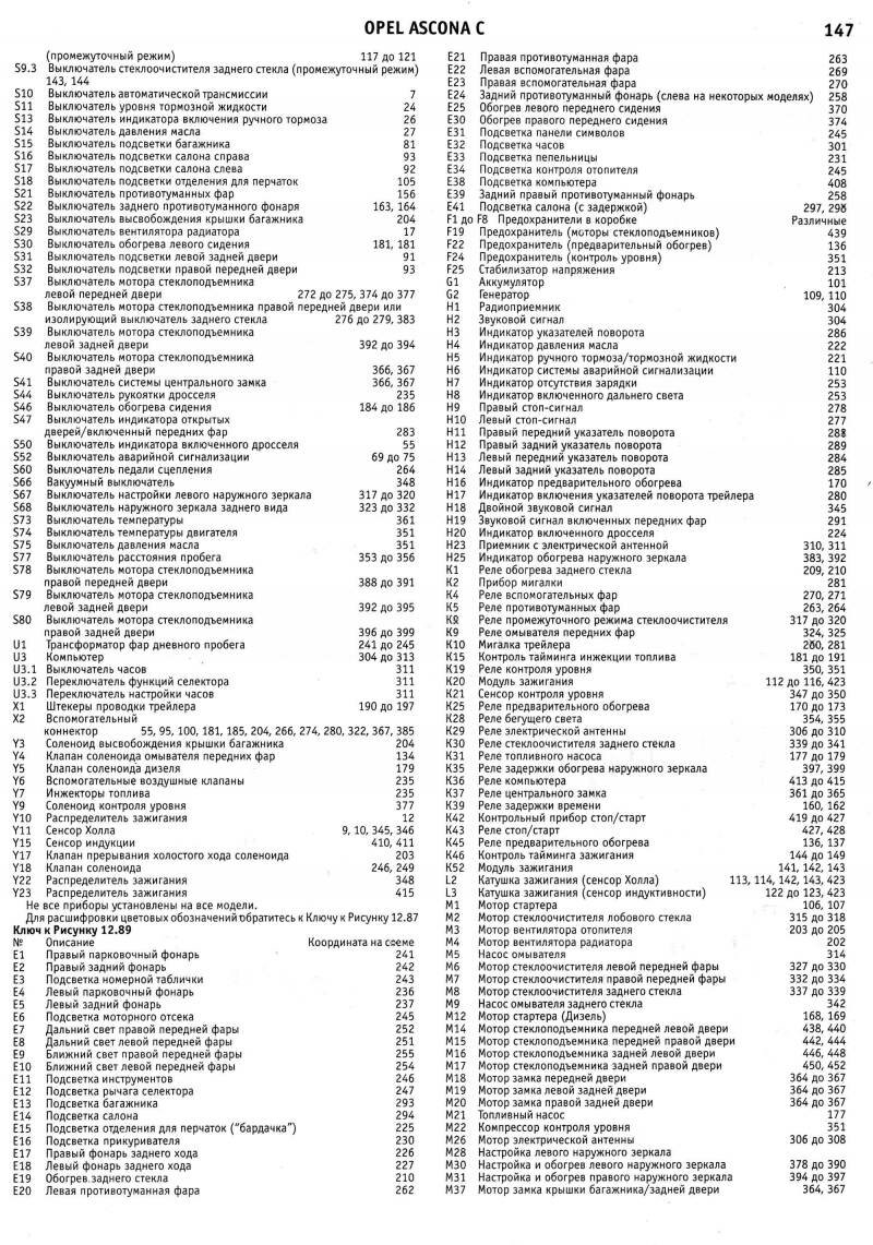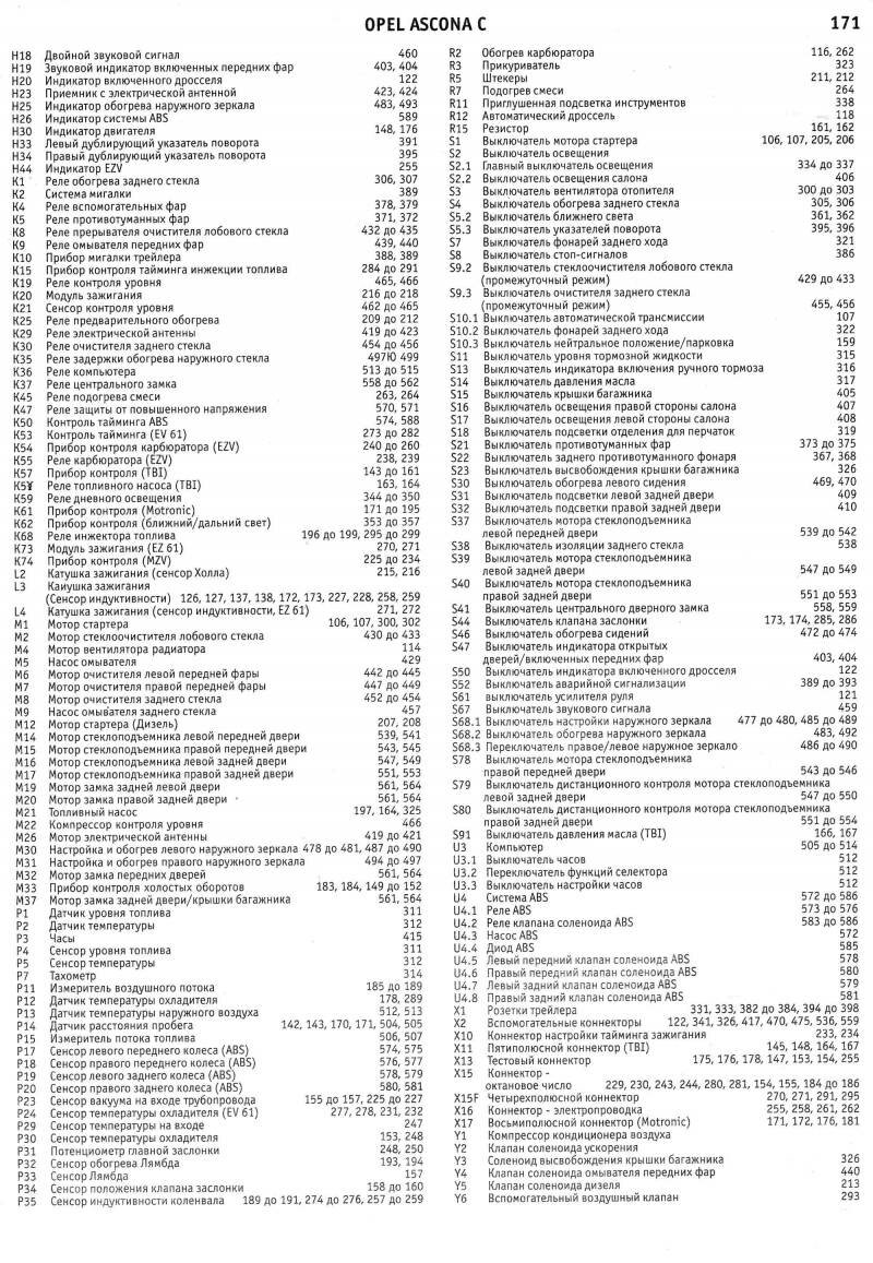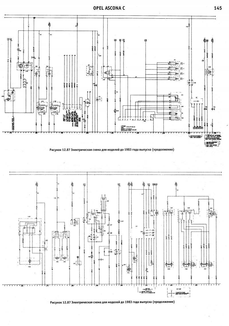 Электросхемы автомобиля Опель Аскона модельного ряда 1983-1988 годов, а именно: Opel Ascona 1984, Opel Ascona 1985, Opel Ascona 1986, Opel Ascona 1987, Opel Ascona 1988. На отдельных картинках приводятся расшифровки и обозначения элементов на схемах. Наименование элементов приведены в соответствии с DIN 40719, обозначение линий в соответствии с DIN 47002. Некоторое наложение участков схем Opel Ascona C облегчает чтение. Предназначено для специализированных автомастерских.