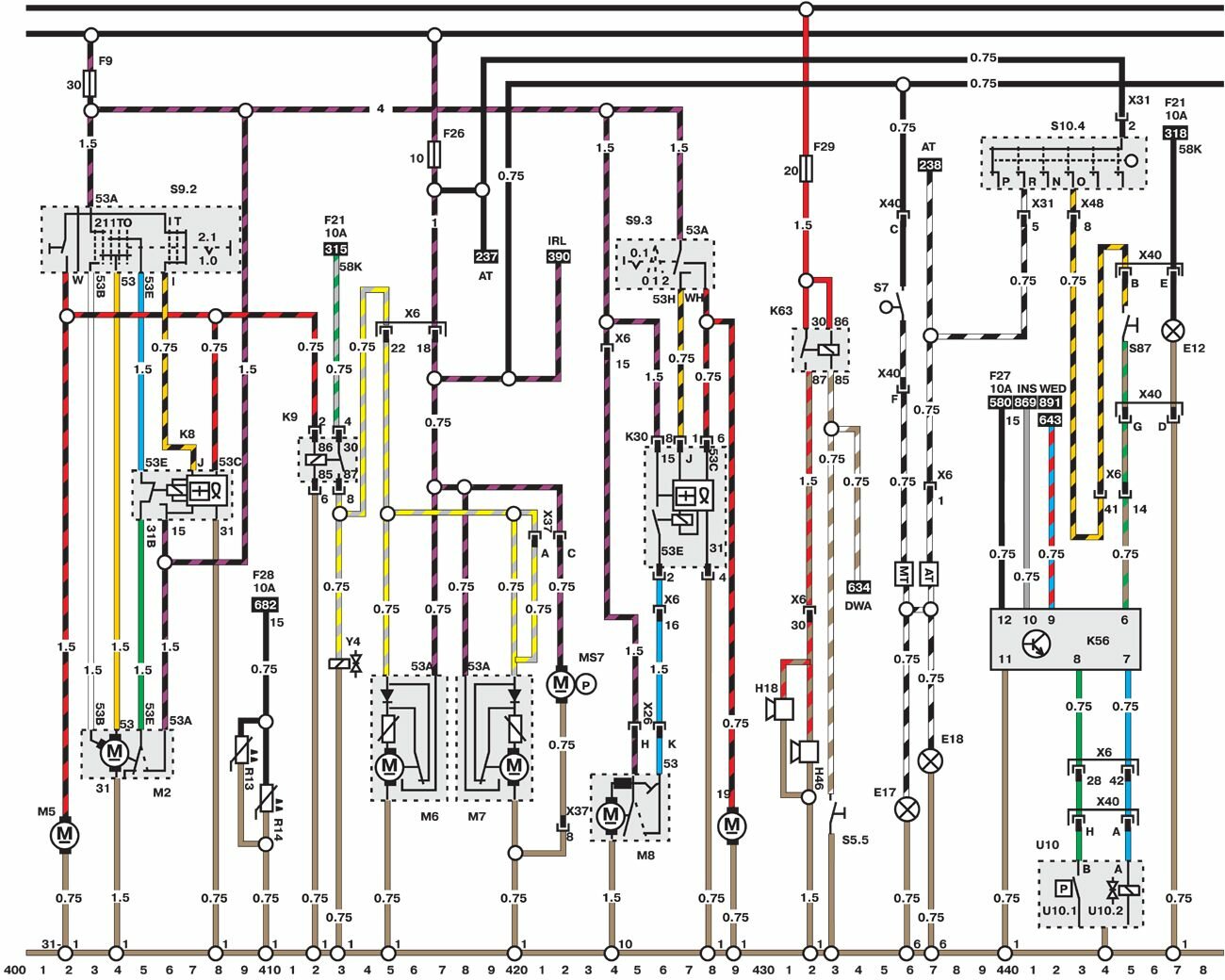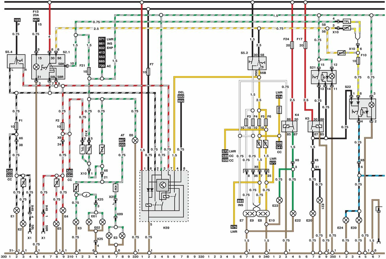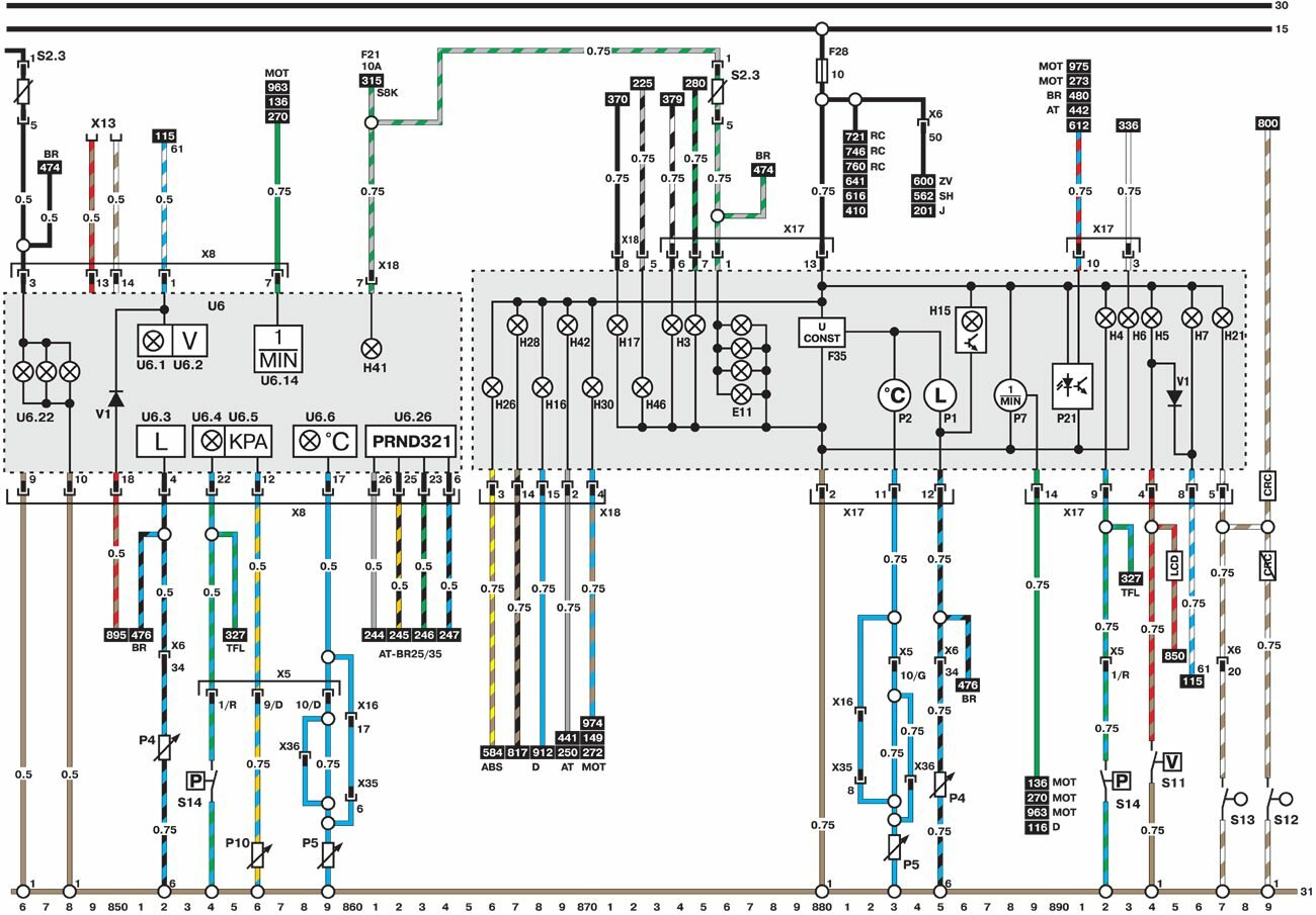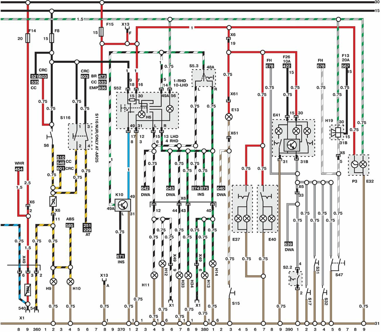 Электросхемы автомобиля Opel Omega (1993-1999). Все схемы в отличном качестве и с подробным описанием компонентов. Чтоб бесплатно скачать необходимую часть схемы - кликните на картинку и сохраните на компьютере. Представленны модули для модели Opel Omega B. Нижняя линия схемы обозначает массу или отрицательное соединение; цифры под этой линией являются номерами дорожек, что позволяет отыскать цепи и элементы при помощи ключа. Линия сверху схемы обозначает положительное соединение. Линия, помеченная номером 30, всегда под напряжением. Линия, помеченная номером 15, находится под напряжением только при включении зажигания.