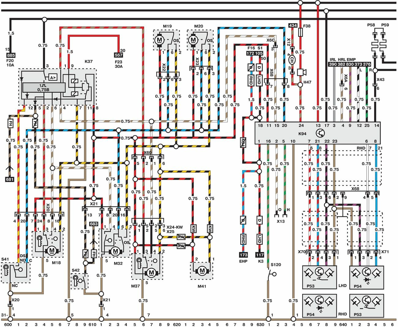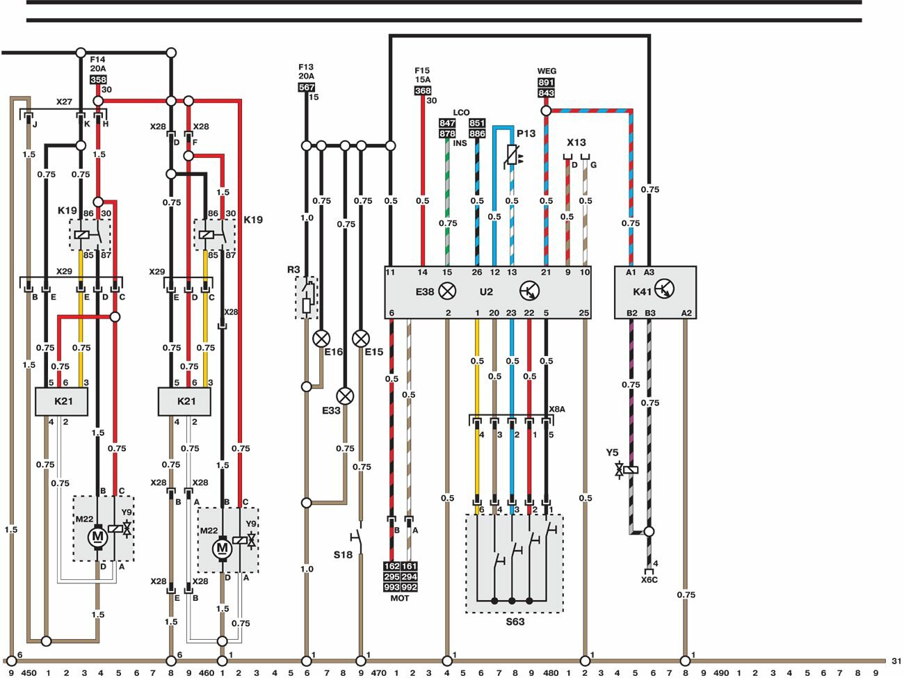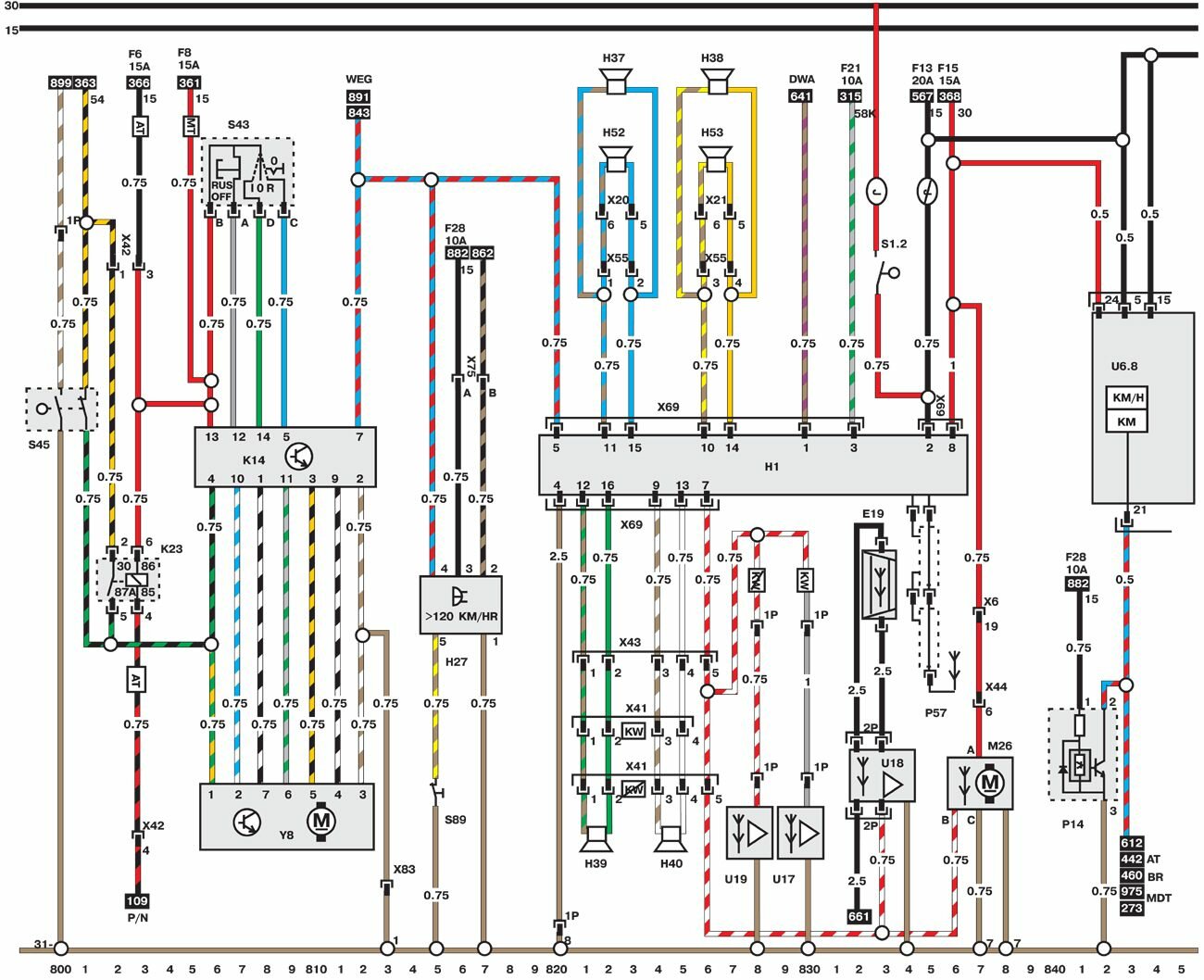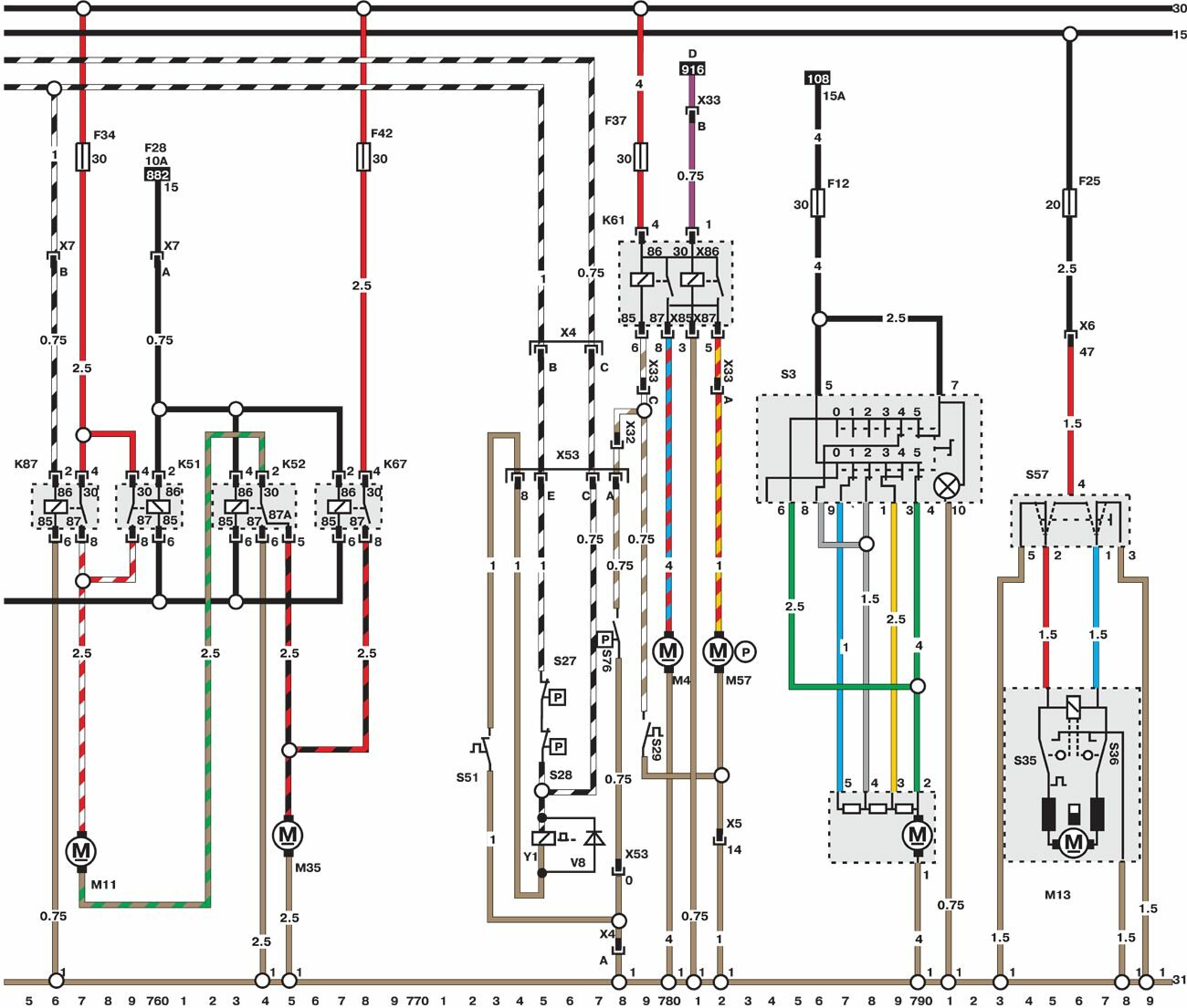 Электросхемы автомобиля Opel Omega (1993-1999). Все схемы в отличном качестве и с подробным описанием компонентов. Чтоб бесплатно скачать необходимую часть схемы - кликните на картинку и сохраните на компьютере. Представленны модули для модели Opel Omega B. Нижняя линия схемы обозначает массу или отрицательное соединение; цифры под этой линией являются номерами дорожек, что позволяет отыскать цепи и элементы при помощи ключа. Линия сверху схемы обозначает положительное соединение. Линия, помеченная номером 30, всегда под напряжением. Линия, помеченная номером 15, находится под напряжением только при включении зажигания.