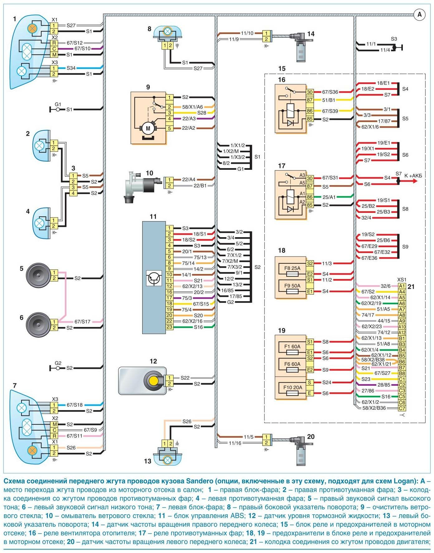Цветные элетросхемы для Renault Sandero. На автомобили устанавливают двигатели рабочим объемом 1,4 и 1,6 л. Внешне двигатели идентичны и отличаются лишь радиусом кривошипа коленчатого вала и высотой блока цилиндров. Коробка передач пятиступенчатая механическая. Коробки передач, устанавливаемые на автомобили с двигателями рабочим объемом 1,4 и 1,6 л, практически одинаковы по конструкции, имеют одинаковые передаточные числа и различаются только размерами картера сцепления, что обусловлено применением на этих двигателях сцеплений разного диаметра. Каждый элемент схемы содержит подробный перечень компонентов соответствующего узла электрооборудования Рено Сандеро.