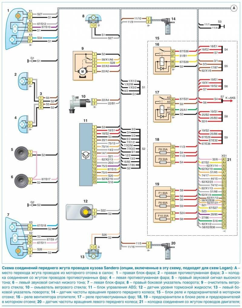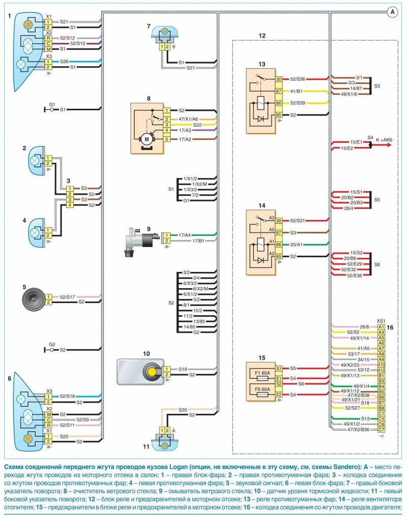 Схема соединений жгута проводов Renault Sandero двигателя 1,4-1,6