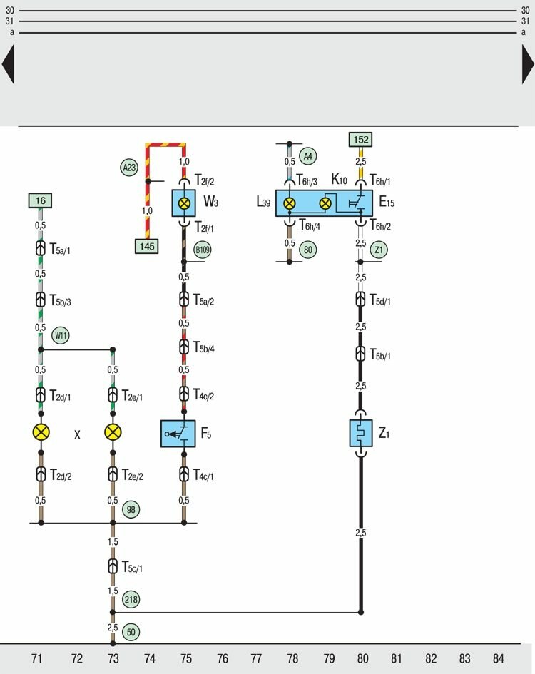 T2e – двухконтактный штекерный разъем, на выключателе для фар заднего хода;
