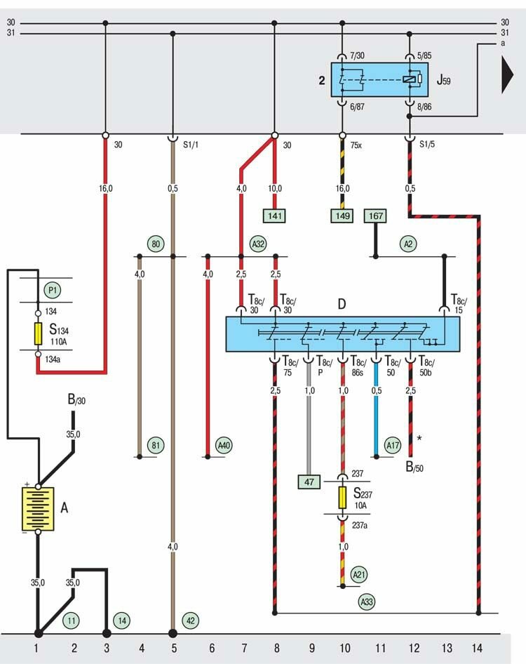 Схема Skoda Octavia - замок зажигания, реле для контакта X, коробка предохранителей