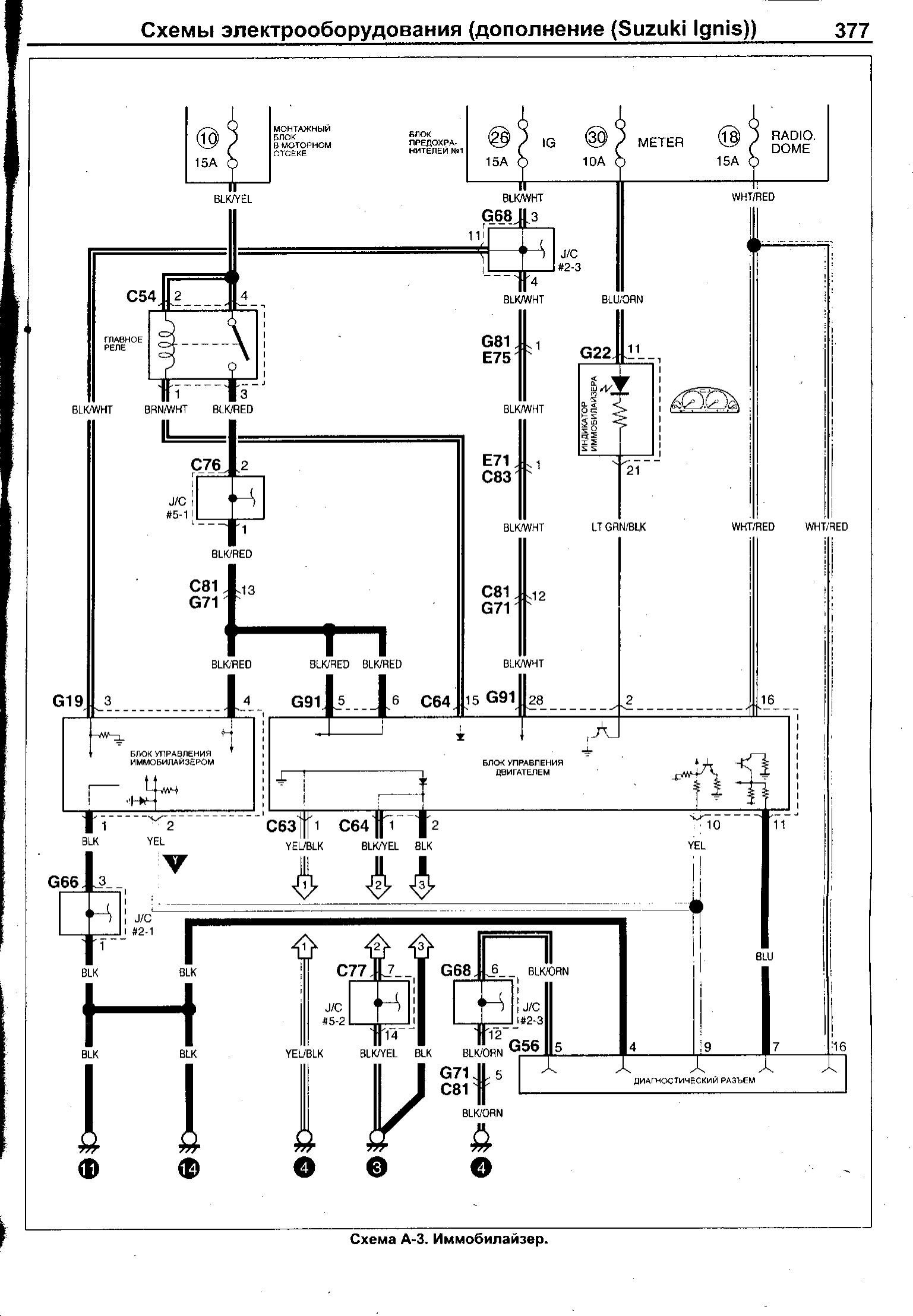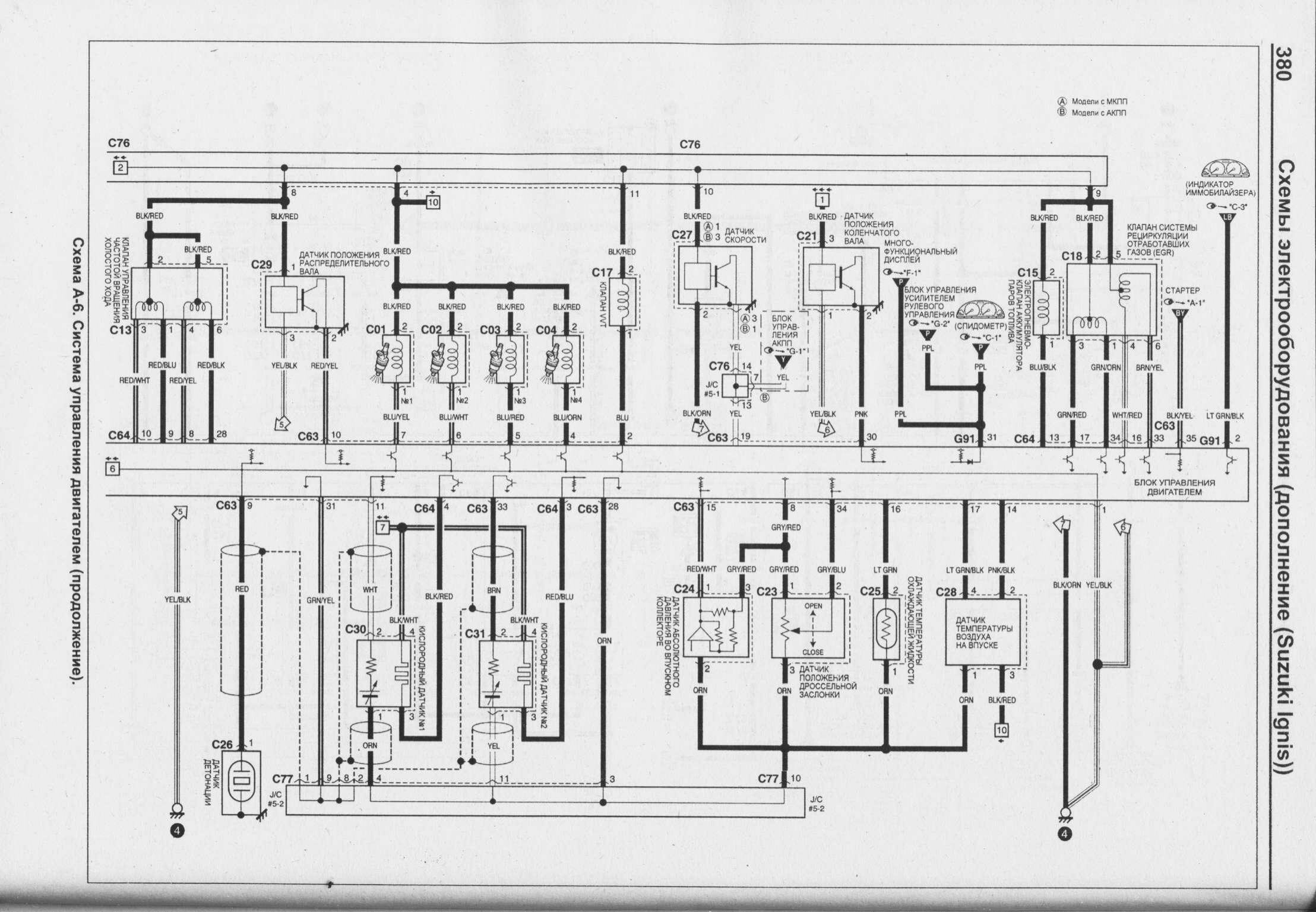 Качественные электросхемы автомобиля Suzuki Ignis на русском языке. Представленна первая часть, содержащая такие узлы: зажигания, управления двигателем, иммобилайзер, указатели поворотов, омыватели стекла и другие. В конце статьи указан пример обозначения элементов на схемах и их расшифровка. Увеличить схему можно кликнув по ней и развернув на весь экран. Вторую часть сборника электросхем Сузуки Игнис смотрите на следующей странице.