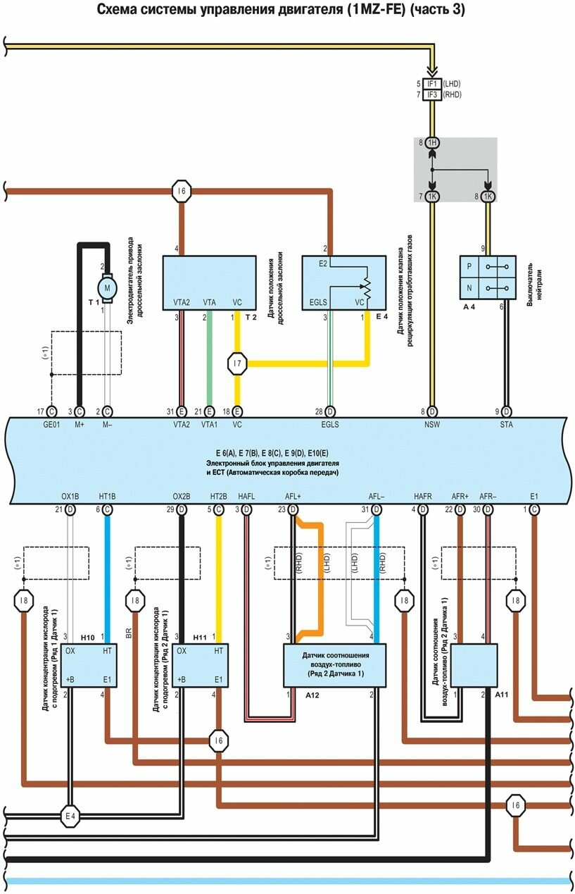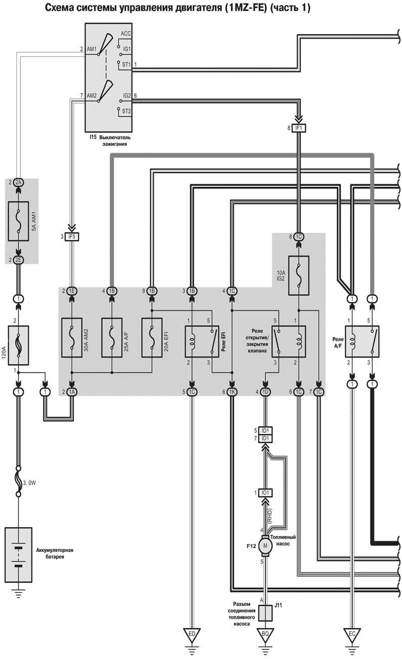 Сборник электросхем от двигателя 1MZ-FE автомобилей Тойота Камри 2001-2005 годов выпуска. Модель Camry обладает прочной внутренней структурой. Конструкция, прекрасно продуманная с точки зрения безопасности и передовых технологий, обеспечит ощущение надежности и всестороннюю заботу о водителе и пассажирах. Автомобиль обладает повышенной прочностью при столкновениях. Передняя и задняя зоны деформации, усиленные стойки и брусья, защищающие от боковых ударов, уменьшают деформацию кабины при столкновении, а также снижают угрозу травмирования людей, находящихся в автомобиле. Для защиты водителя дополнительно предусмотрены убирающийся педальный узел, что сводит к минимуму вероятность травмы ног, и травмобезопасная энергопоглощающая рулевая колонка, которая действует совместно с ремнями безопасности и подушками безопасности, уменьшая риск травмы при столкновениях.