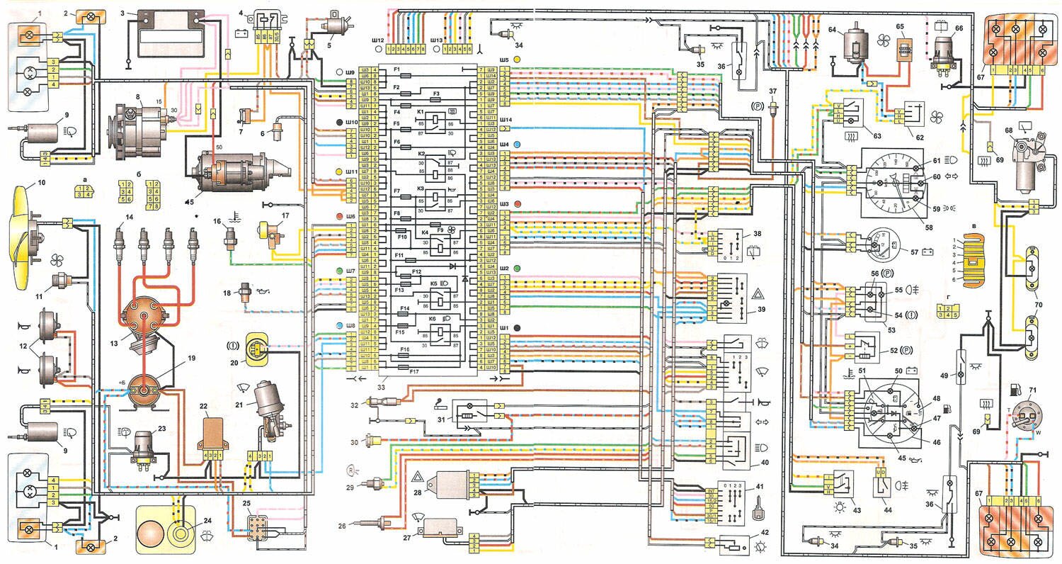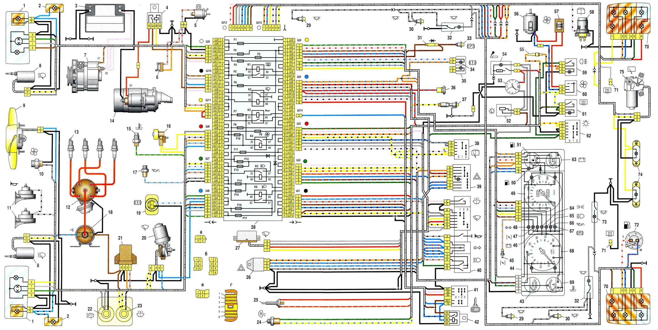 Схема ВАЗ-2104, для автомобилей ранних годов выпуска. От стандартной схемы ее отличают генератор Г-222, 10-ти контактный включатель аварийной сигнализации, 5-ти контактное реле указателей поворотов и аварийной сигнализации, датчик верхней мертвой точки 1-го цилиндра, колодка диагностики, лампа-индикатор обогрева заднего стекла непосредственно в выключателе, отсутствие контрольной лампы воздушной заслонки карбюратора, двухпозиционный выключатель внешнего освещения и трехпозиционный подрулевой переключатель света.