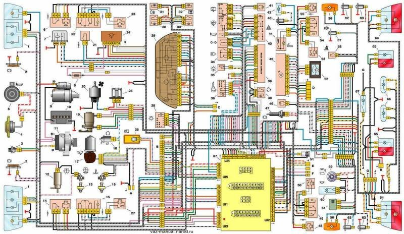 Схема ваз 21102 будет полезна для самостоятельного ремонта авто. На ней указаны все реле, фары, электродвигатели и разъёмы. Рекомендации по ремонту: Не работает электронный спидометр - повреждены цепи питания комбинации приборов, датчика скорости, дорожки платы комбинации приборов. Надо обожать клеммы, заменить неисправные провода, комбинацию приборов. Не работает тахометр - повреждены цепи питания комбинации приборов, управляющая цепь тахометра, дорожки платы комбинации приборов. Не загораются контрольные лампы - плохой прижим патрона к цоколю лампы или лепестков патрона к печатной плате, повреждены провода, окислены или неплотно надеты их наконечники, сгорела лампочка. Постоянно горит контрольная лампа резерва топлива - замыкание провода датчика на "массу".